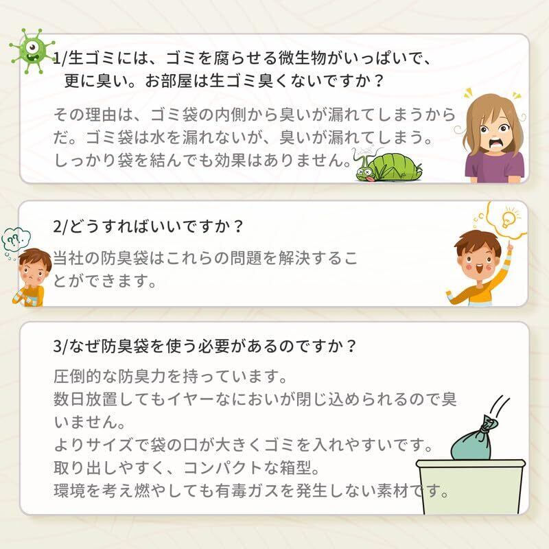 【驚異の臭わないゴミ袋】弊社の防臭袋は密閉性の高い素材で作られており、臭いの漏れを効果的に防止します。快適で臭いのない環境をお楽しみください。破れや漏れにくいので、長期間使用することができ、安心してご利用いただけます。