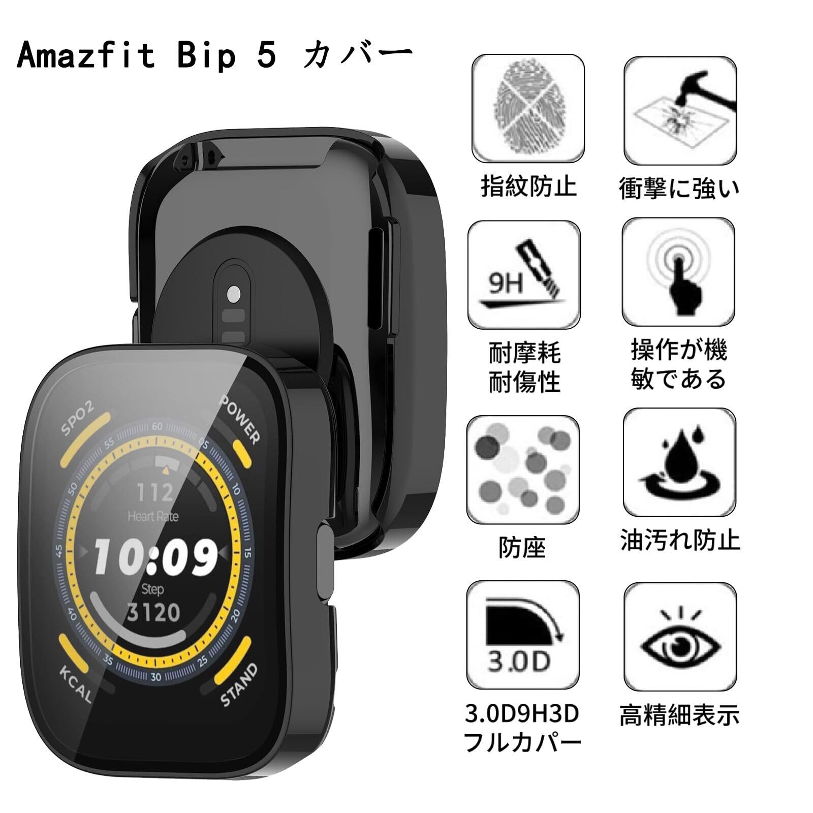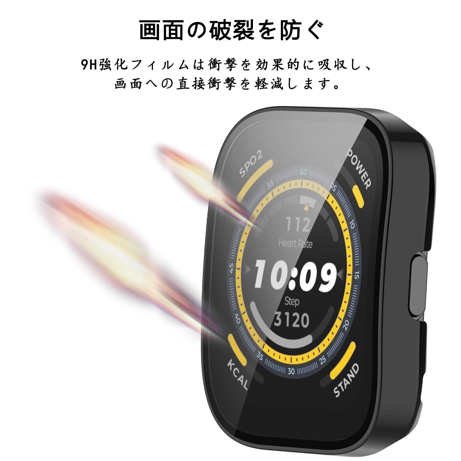 【全面保護カバー】高透明度の日本製ガラスと約1.3mmの薄さ、わずか2.13gの軽量なPC枠を採用。これにより、外部の衝撃から大切なAmazfit Bip 5 を守ります。硬度9Hの強靭な液晶部保護フィルムも備えています。さらに、透明度の高い液晶ガラス素材を使用しており、本来の明るくカラフルな画質を保ちます。