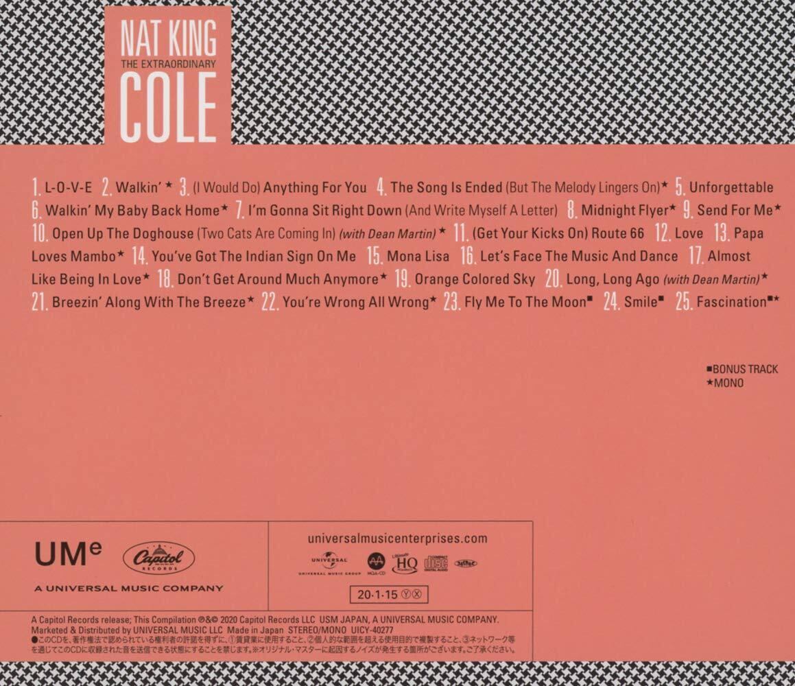 世界を魅了したポピュラー・ヴォーカルの第一人者、ナット・キング・コールの決定版ベスト。代表曲「アンフォゲッタブル」「フライ・ミー・トゥー・ザ・ムーン」「スマイル」ほか、全25曲収録。 (C)RS