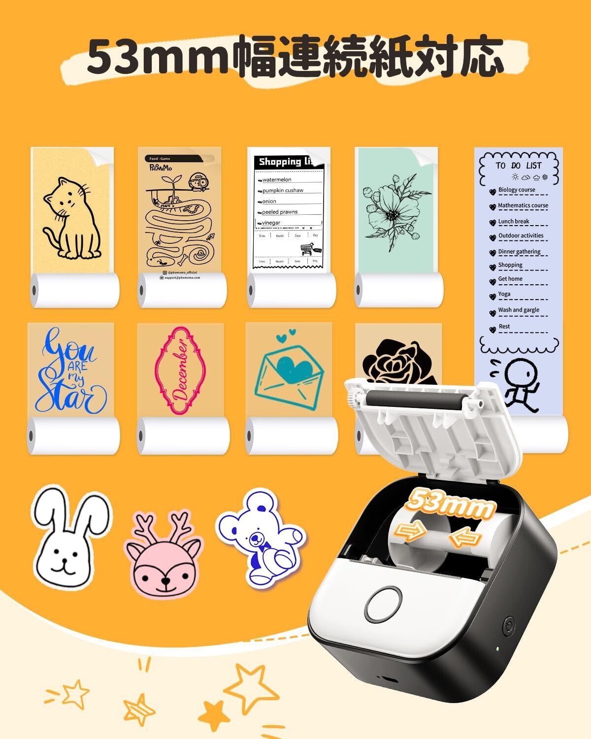 Memoqueen T02 サーマル ミニプリンター スマホ対応 モバイル ラベルライター Bluetooth 持ち運び 白黒 プリンター はがき/手帳/メモ/ノート/買い物リスト/フォト/学習ノートに使用することができます 専用アプリアプリ 家計簿用 在宅勤務 自宅学習 本体にはロール状の53mm幅 感熱紙が付属しています 黒のプリンタ