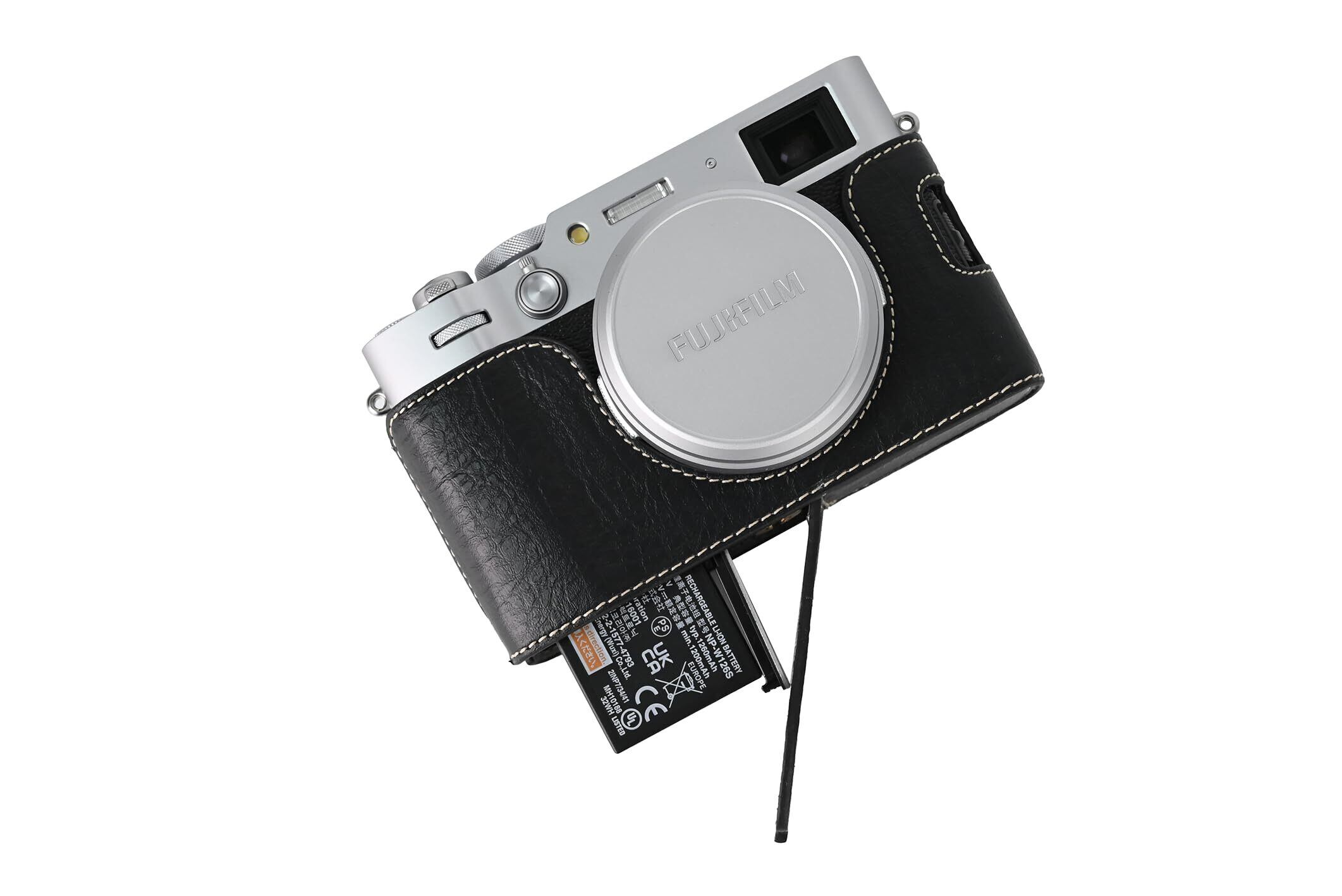 ④Fujifilm X100Ⅵカメラの形を合わせて作られるので、穴の位置が精確で、カメラの使用に影響を与えません。このケースを装着したまま直接に三脚に取り付けることができ、バッテリーとSDカードの取り外しと取り付けも可能です。カメラの画面のフリップにも影響を与えません。