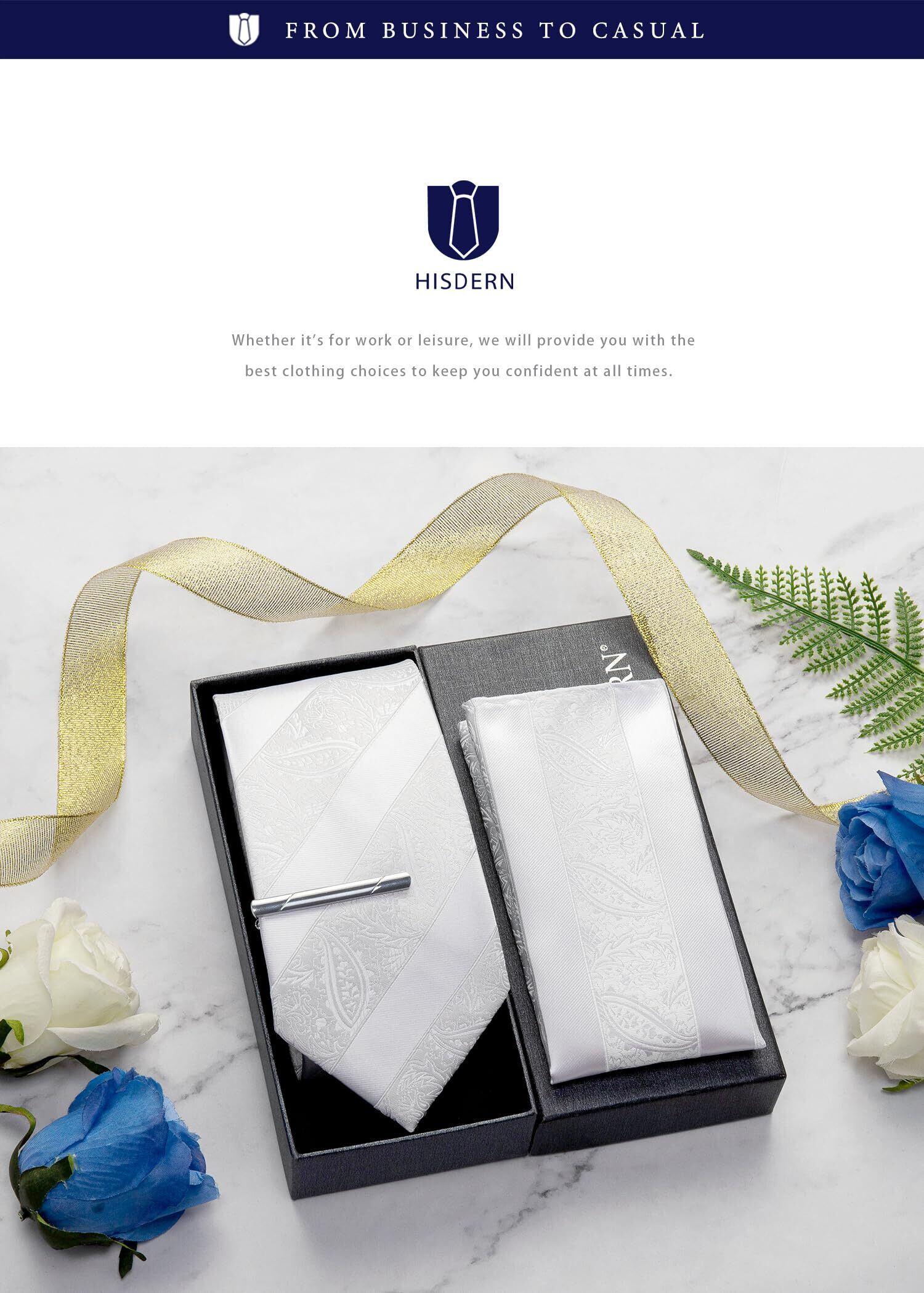 【3点セット】ネクタイ1本 + ポケットチーフ1本 + ネクタイピン1本 、HISDERNブランド専用ボックスが付き 商品サイズ:ネクタイ 幅8.5cm / 長さ150cm | ポケットチーフ: 31cm*31cm | ネクタイピン:5.8cm × 0.6cm。