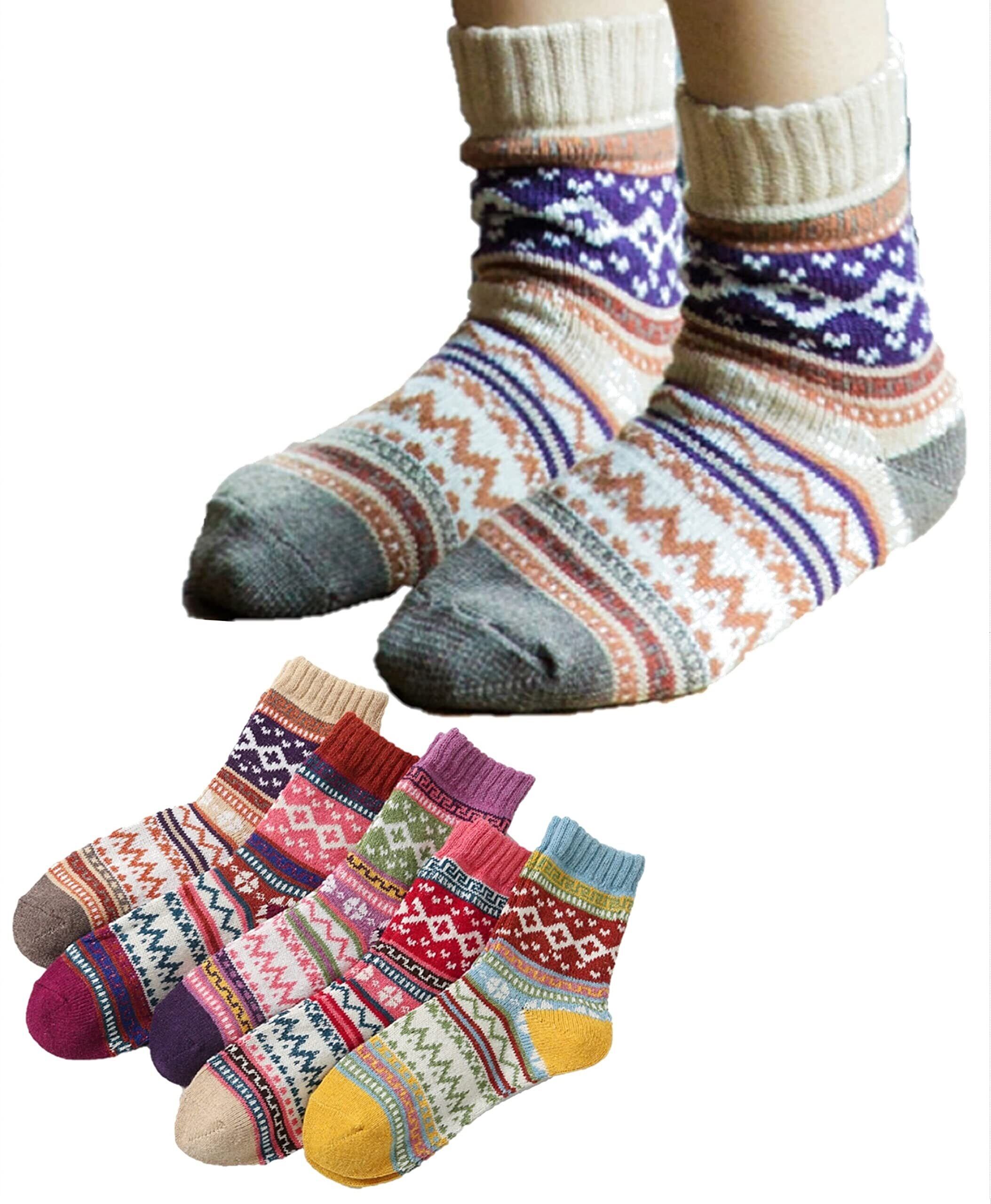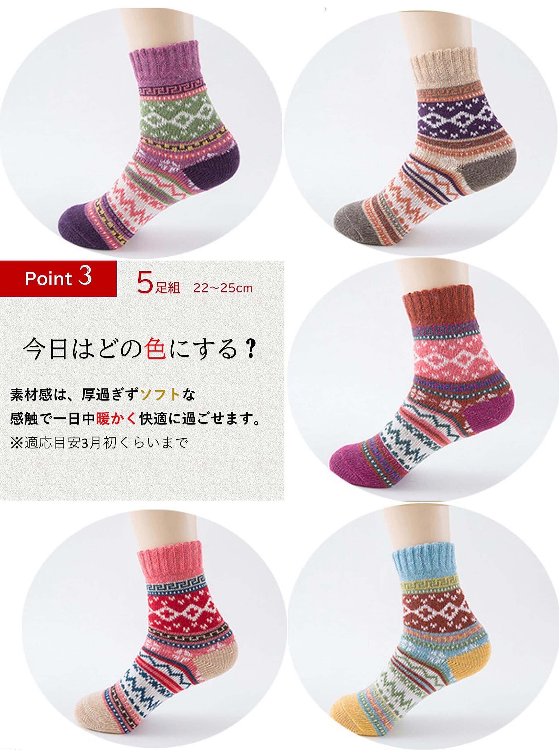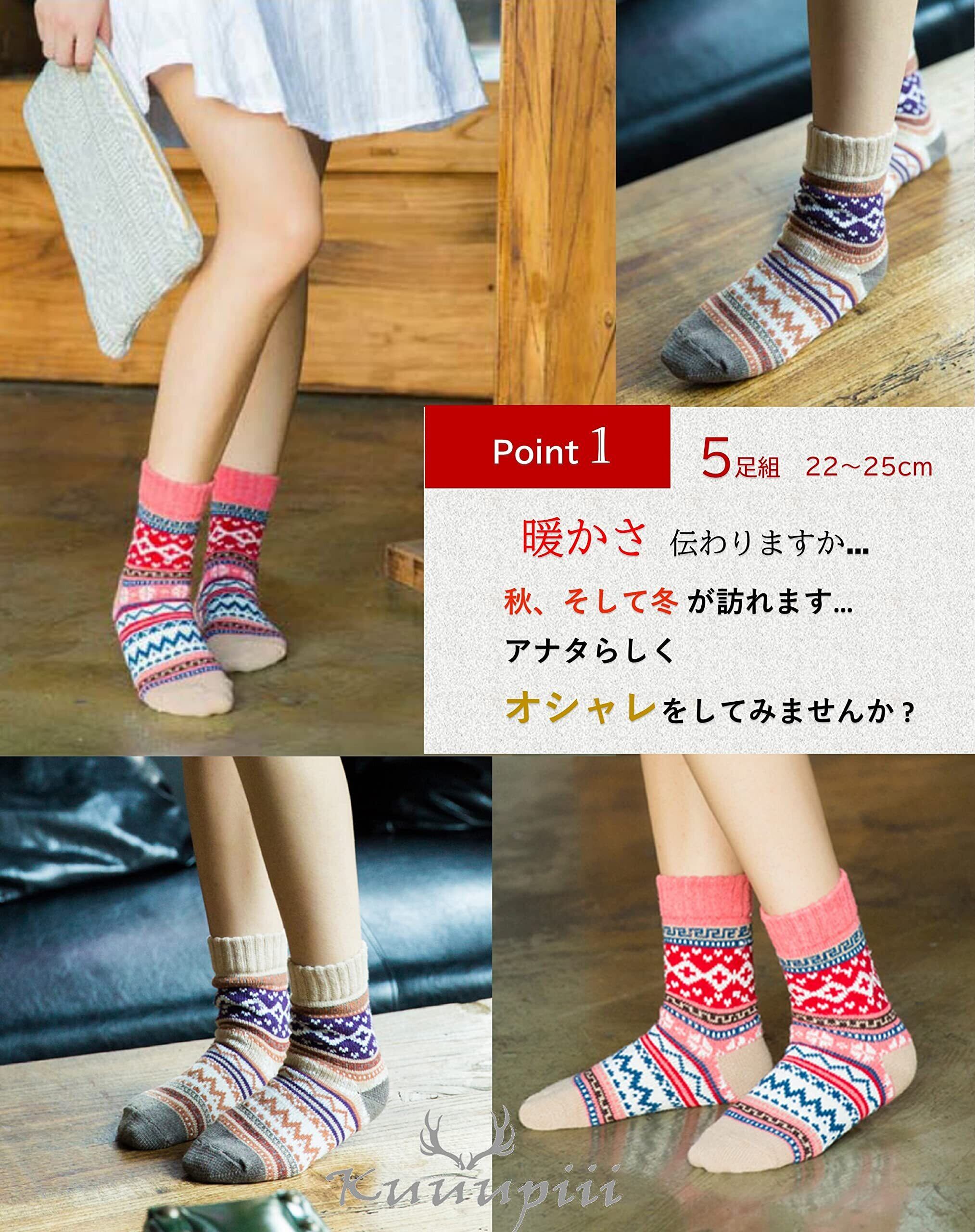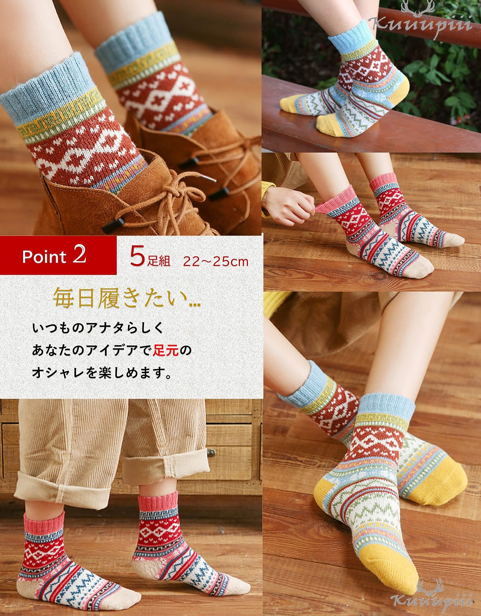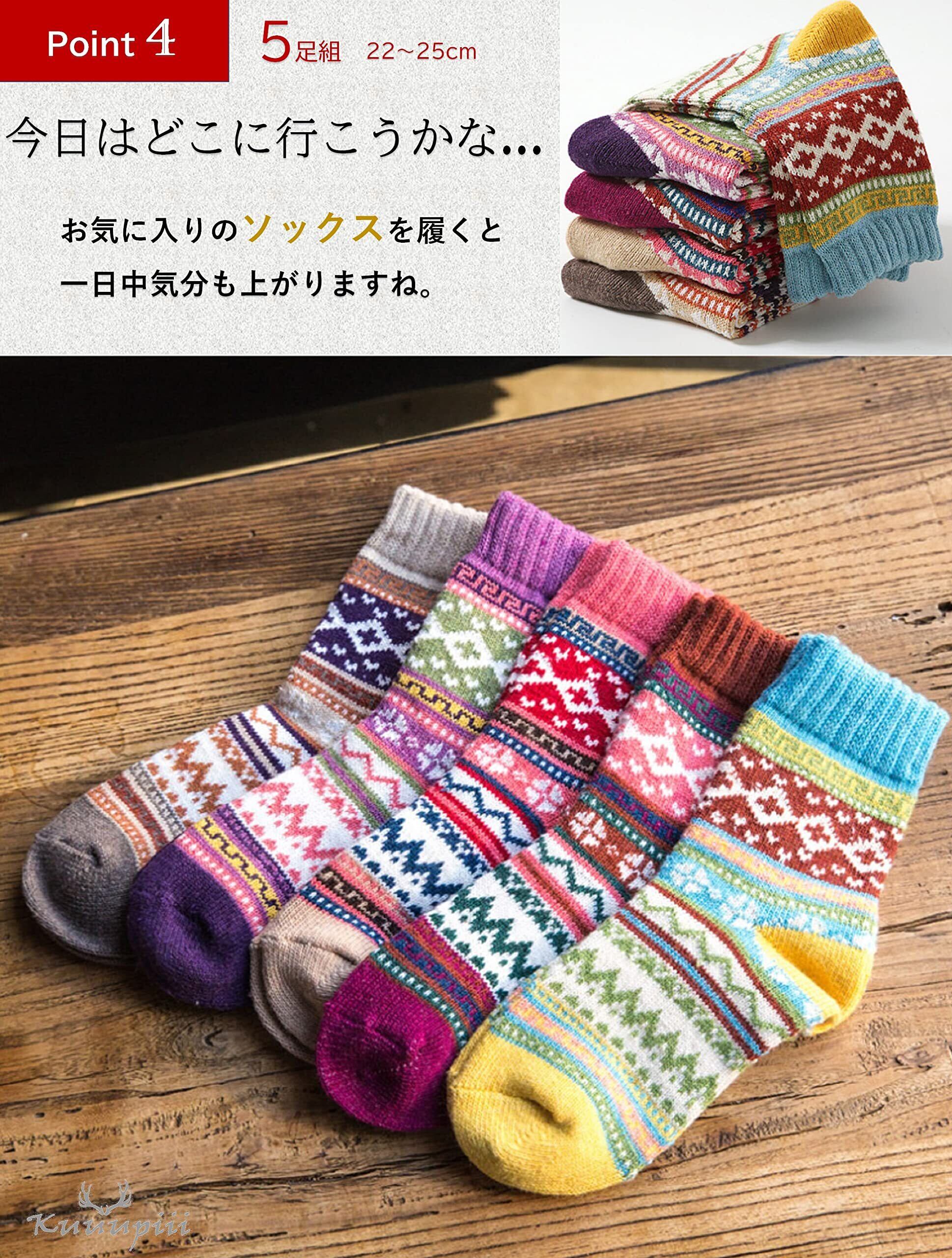 [kuuupiii] レディース ソックス 靴下 冬 厚手 暖かい あったか 防寒 登山 おしゃれ かわいい クルーソックス 柄物 ソフト口ゴム ボーダー カラフル 秋冬春 5足組 22-25cm