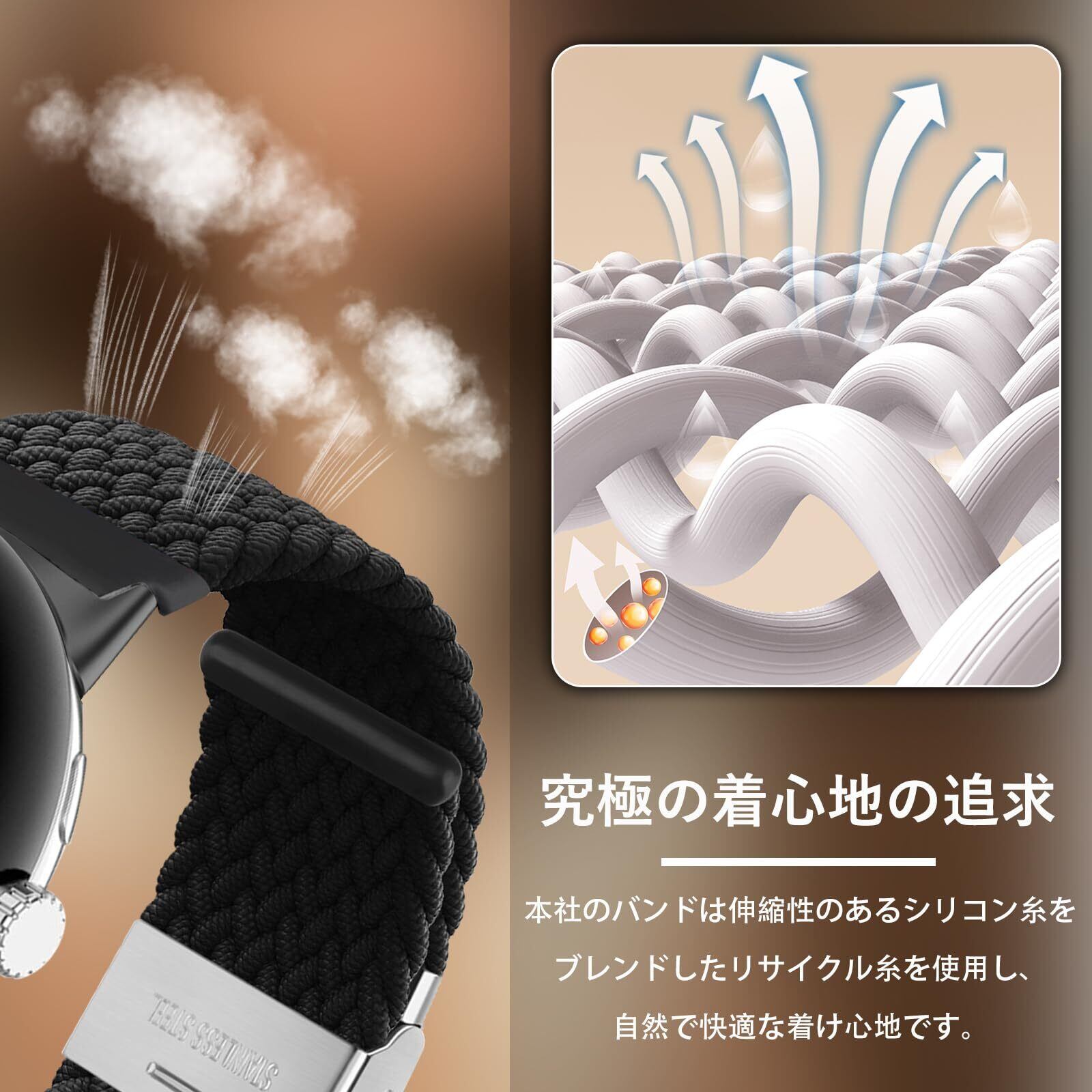 [ 極上の着け心地を追求 ] Google Pixel Watch 3 45mm 対応バンドは伸縮性のあるシリコーン糸混紡リサイクルヤーンを使用しています、肌に密着する部分に伸縮性の高い繊維が加えられているため、窮屈感がなく自然な着け心地を実現します。激しく動いて手首に擦れても皮膚が傷つけません。そのため、激しい運動中や就寝中に着用しても心配ありません。また、バンド全体に細かい穴が空いており通気性が高いため、汗をかきやすいジョギングなどの運動時にもぴったりです。