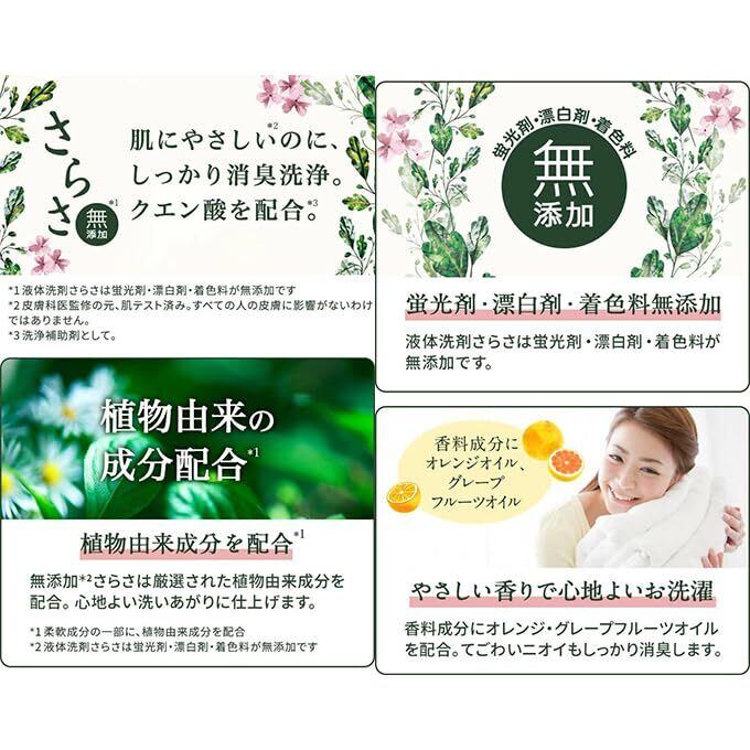 新しくなったさらさは、無添加*1さらさ史上、最高洗浄力を実現。 クエン酸配合*2だから、手ごわい汚れ・ニオイの元も洗浄します。 植物由来の厳選成分を配合*3で大切な肌を優しく包み込みます。