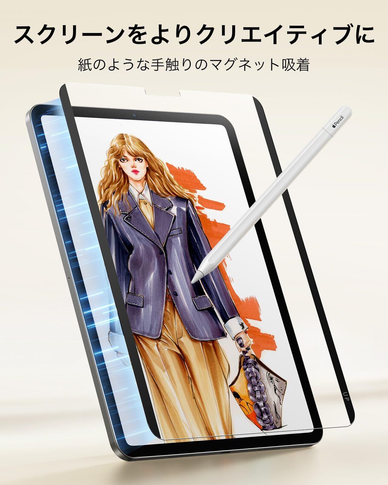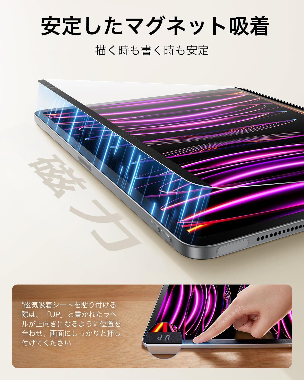 【便利な磁気吸着】:マグネットエッジは、必要時にiPadのスクリーンに簡単に取り付けることができ、元ディスプレイの完璧なビューへ戻すときは、素早く取り外せます。