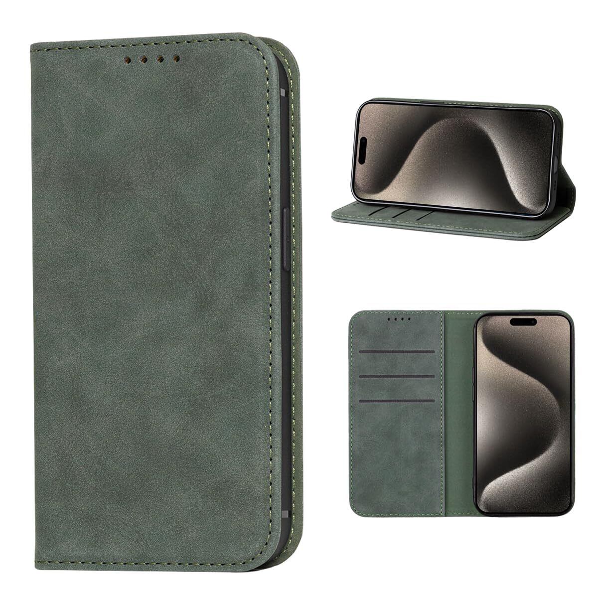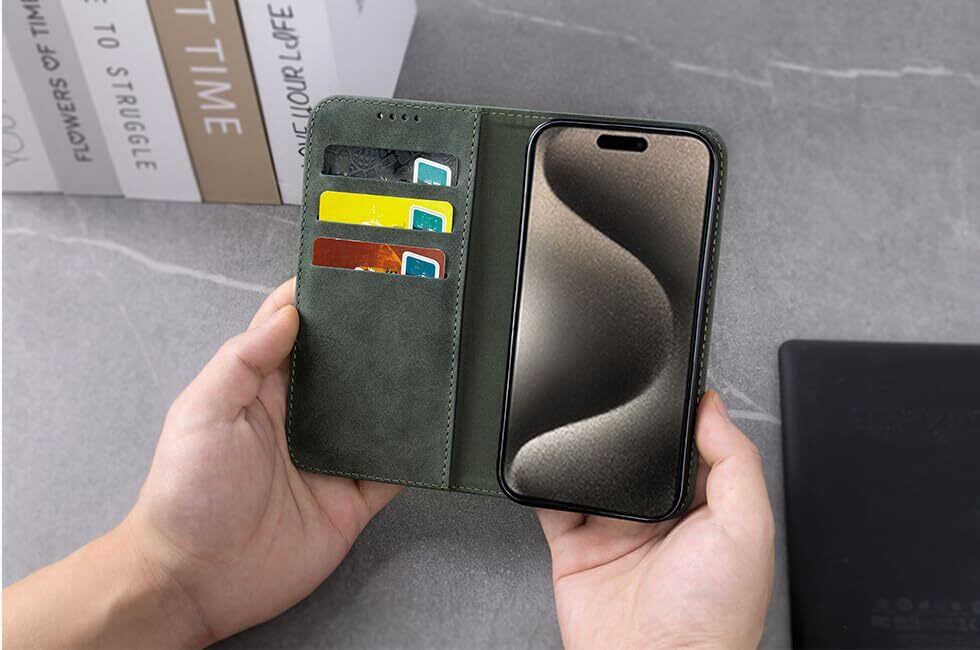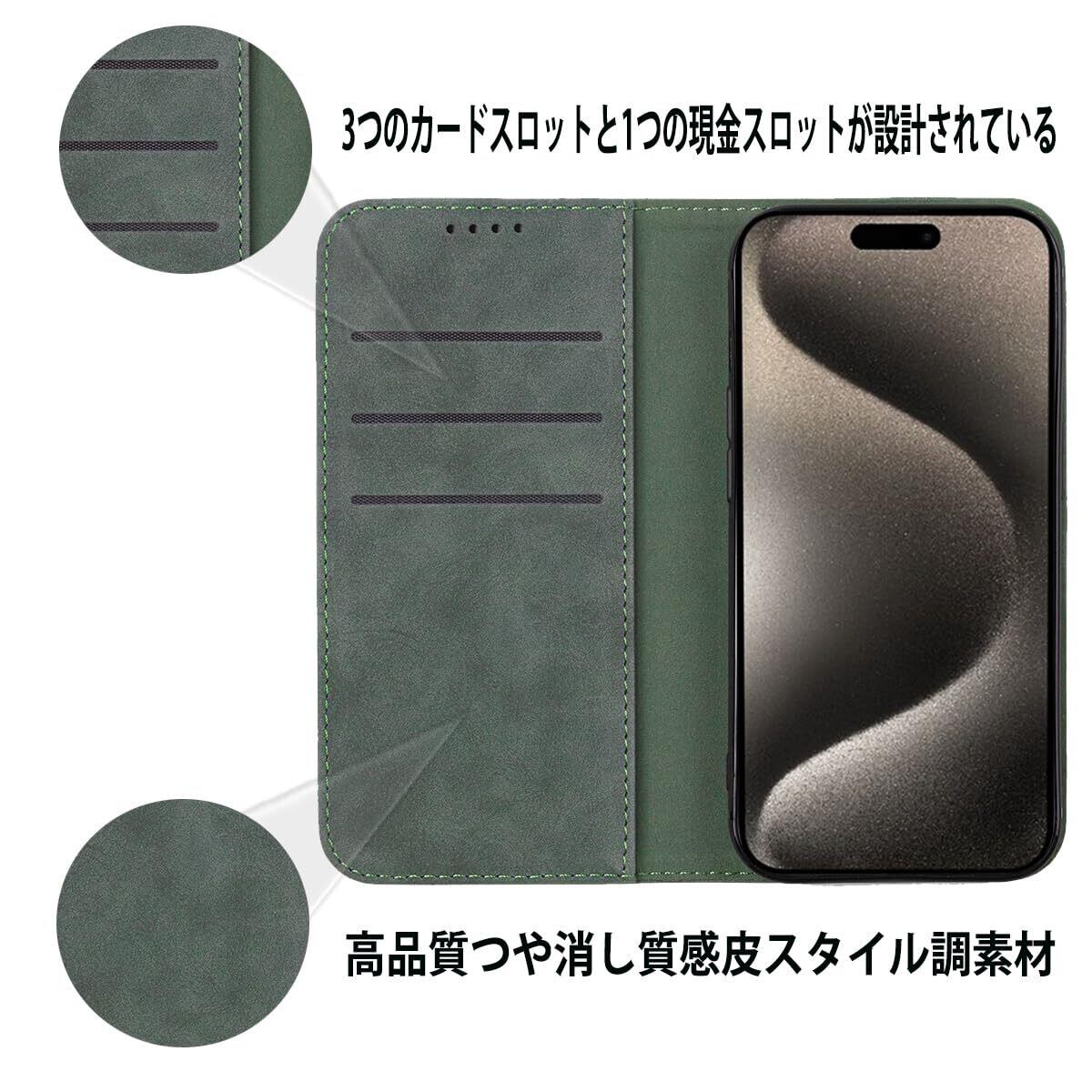 NanHou iPhone 15 Pro Max ケース 手帳型 つや消し レザー スタイル質感 カバー 手帳型 耐衝撃 保護カバー 内蔵マグネット 財布型 iPhone 15Pro Max携帯カバー カードポケット スタンド機能手帳型 - ダークグリーン | BASE SHOP