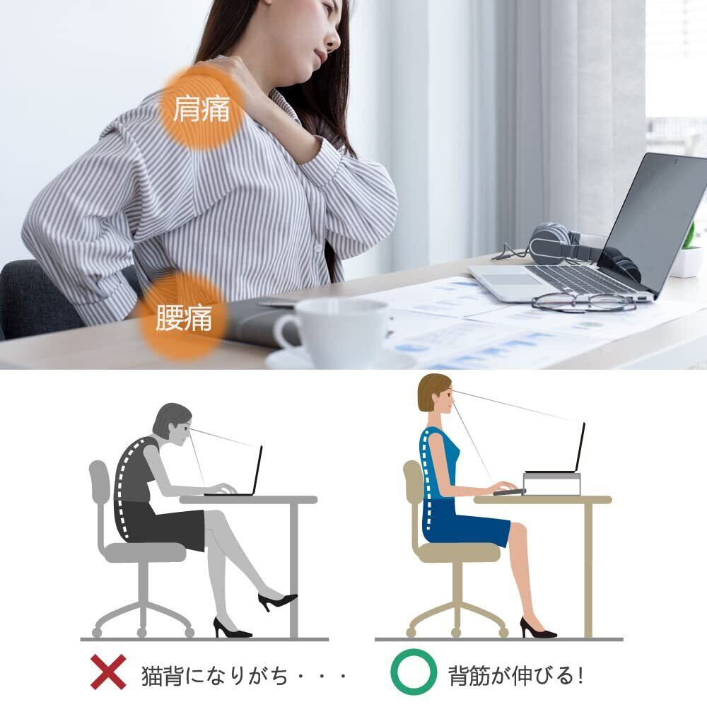 【人体工学設計】 ◆モニターの高さを3段式で調節して、目線が高くなり、姿勢を正すことで操作がしやすく、長時間の作業が快適になります。 ◆目線が上がって本来の正しい姿勢をキープすることでき、首や肩の負担を軽減することに繋がります。