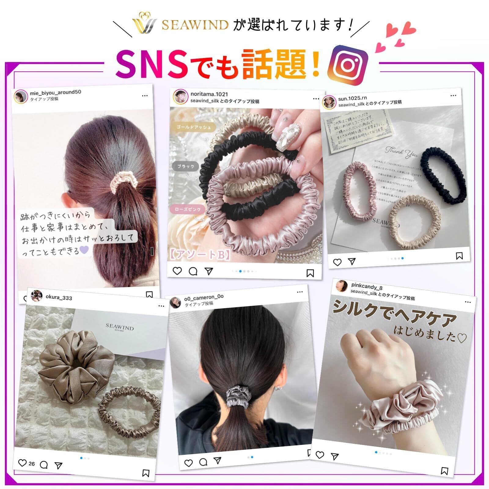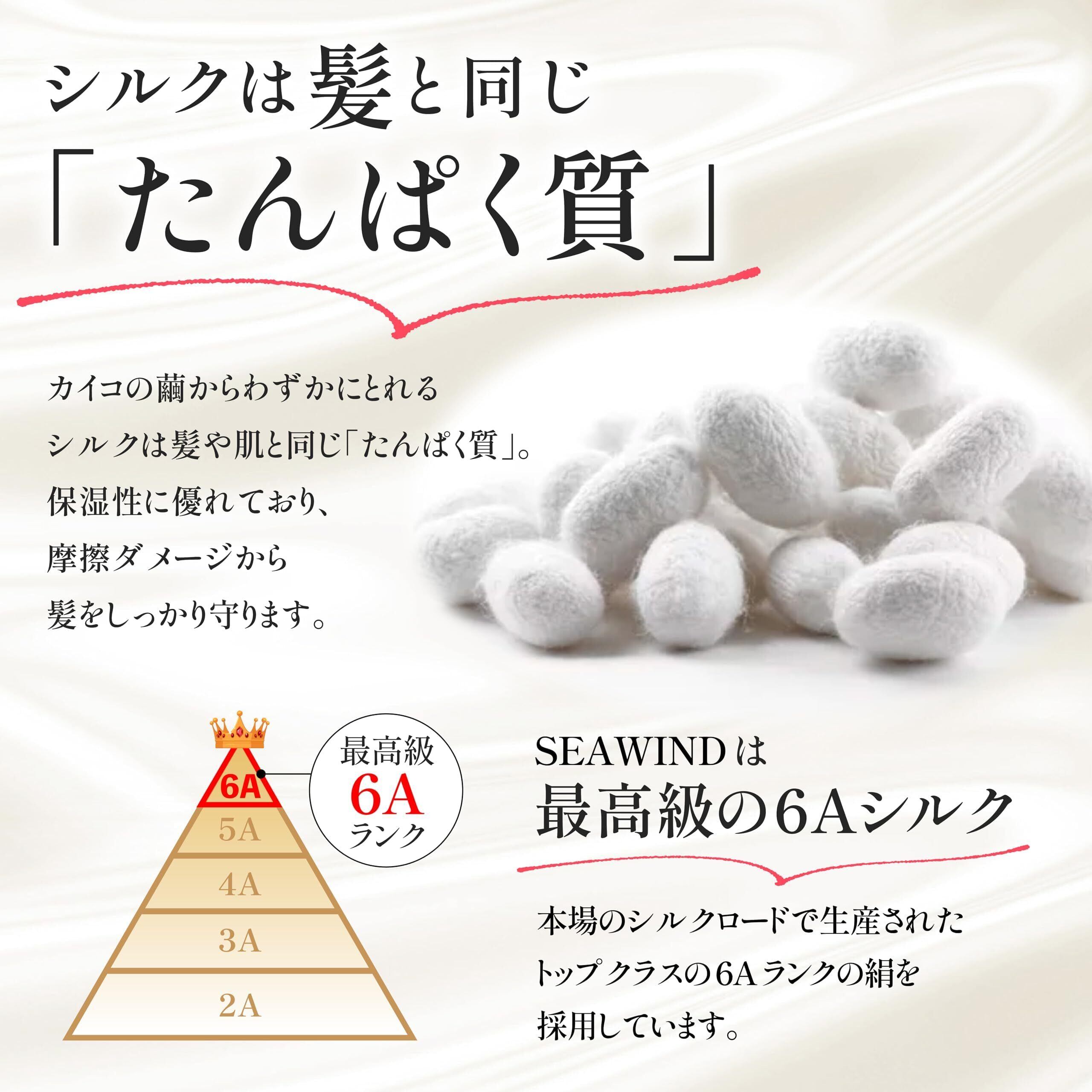 【美髪のヒミツ】SEAWINDのシルクヘアゴムは6Aランクの最高級シルクを使用!シルクは18種類のアミノ酸が結合した繊維で、主成分は人の皮膚と同じ「タンパク質」。美髪効果が期待される成分「フィブロイン」が豊富に含まれています。
