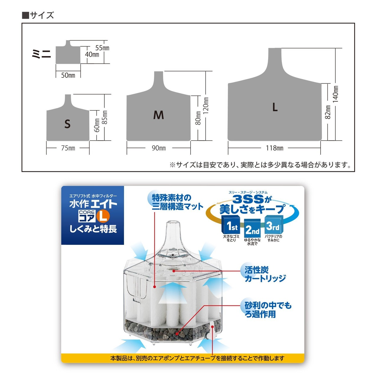 信頼と実績の小型水中フィルターの定番品です。水槽内に設置したままでもろ材を交換できるようになり、メンテナンス性が向上しました。高性能活性炭で、白ニゴリ、黄ばみ、悪臭を素早く吸着します。カートリッジは飼育している魚の種類や水の状態に合わせて「水作エイトL用カートリッジ(別売)」各種を使用することができます。マットは特殊素材の三層構造で、物理ろ過、生物ろ過に適しています。カートリッジとマットは別々に交換可能なので、理想的な水づくりの実現に便利です。しかも経済的です。独自の特許技術により多方向(水中や砂利の中)から水を吸い込み、魚や微生物に効率よく酸素を供給します。水槽の底砂利に本品を埋める