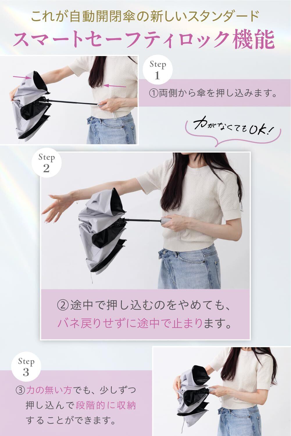 【スマートセーフティロック機能搭載!】収納時に途中で手を離しても“戻らない”。バネの跳ね返りを防止し、力の弱い方でもスムーズに収納できます。