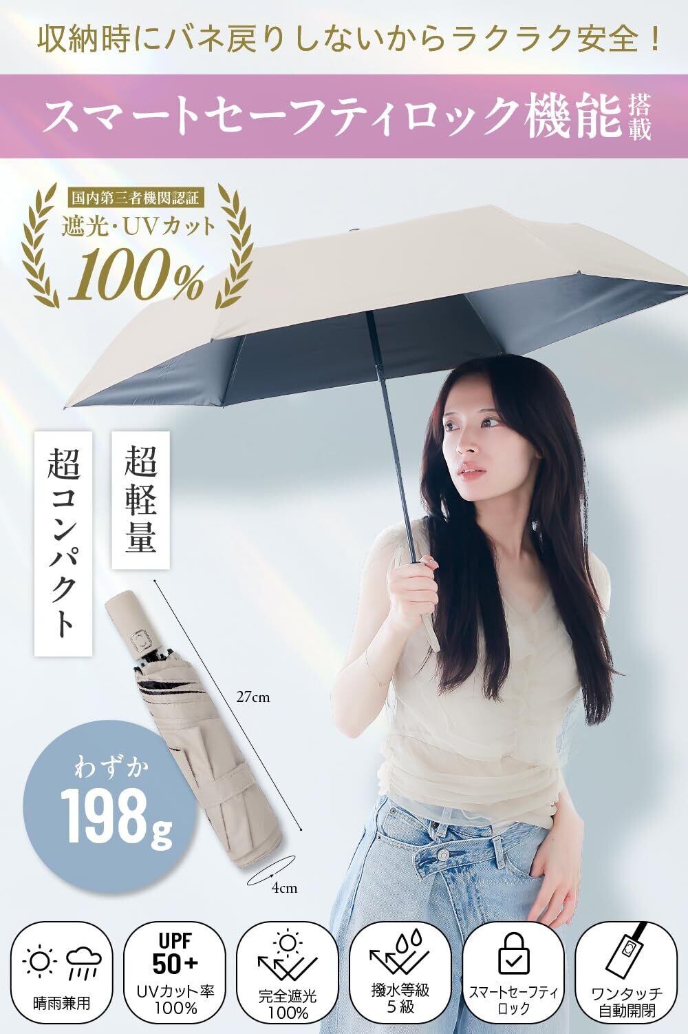 【スマートセーフティロック機能搭載】 日傘 超軽量 コンパクト 折りたたみ UVカット率100% 完全遮光 軽量 晴雨兼用 レディース メンズ 男女兼用 遮熱 携帯便利 ワンタッチ自動開閉