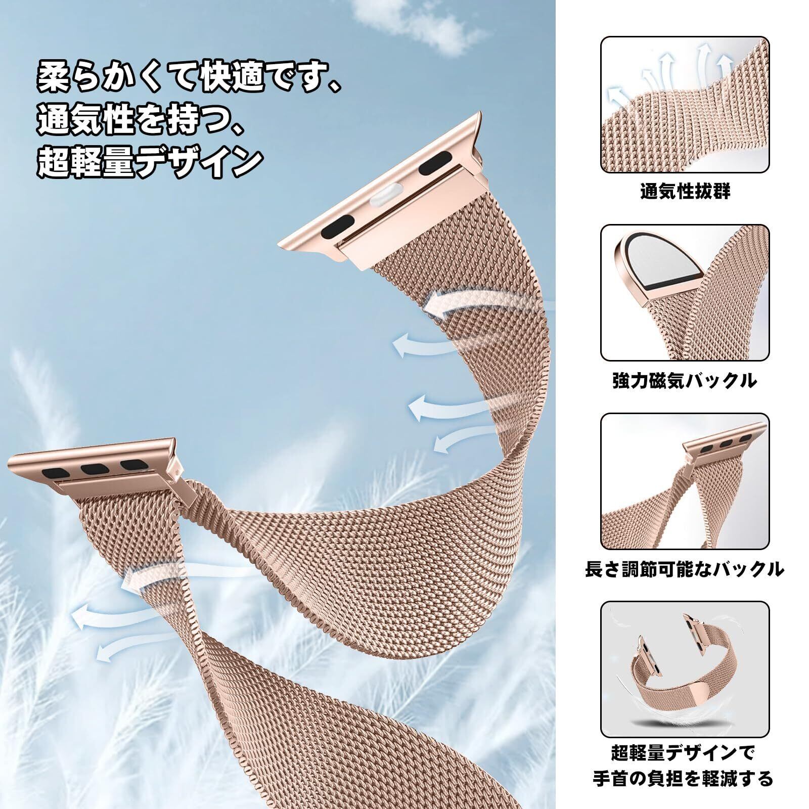 【優れた素材の通気性】対応 アップルウォッチバンドのデザインは通気性を考慮しており、メッシュ構造が手首周りの通気性を向上させ、汗をかく季節でも蒸れずに快適にご使用いただけます。独特のマグネットロックと研磨工芸で研磨されたエッジにより、日常の使用に強力な安定性とセキュリティを提供いたします。ご安心して使用できる Watch バンドです。