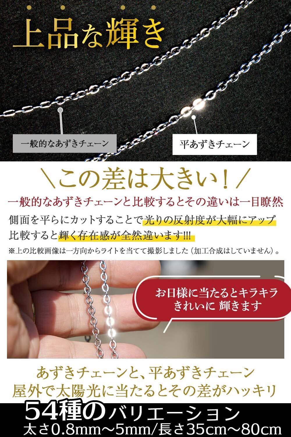【キラキラ輝く平あずきチェーン】Napistの あずきネックレスチェーン は 上品に輝くワンランク上の平あずきチェーンを採用しています。あずきチェーンは各ピースの向きが交互に連なりますが、その各ピースが一般の丸型よりも両面を平らにカットしている平あずきの方が光を受けてキラキラと輝きます。またあずきチェーンは各ピースの隙間がほど良い抜け感を演出し派手過ぎずない上品さを醸しだしてくれます。トップを着けずチェーンだけでもおしゃれなチェーンです。
