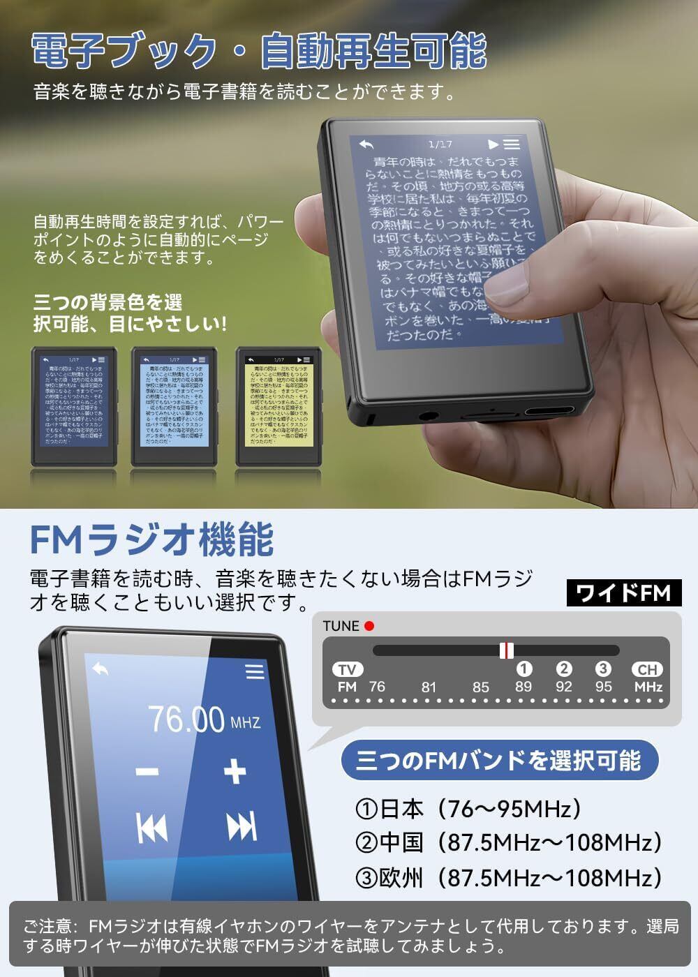 【電子ブック&FMラジオ機能】電子ブックの設定には、自動再生機能を備え、自動再生時間を設定すれば、パワーポイントのように自動的にページを捲ることができます。そして、背景色は3つ(クラシックブラック/純白/カウハイドイエロー)選択可能、異なる光線環境で目を保護することができます。多機能MP3プレーヤーにはFMラジオを搭載、有線イヤホンのワイヤーをアンテナとして代用しております。自動選局でき、選局した後自動的にラジオ放送局を保存します。ラジオ放送局を聞きながら、電子書籍を読むことができます。(ご注意:FMラジオは有線イヤホンのワイヤーをアンテナとして代用しておりますので、FMラジオ機能を使用する時、BTイヤホンと接続しても音は有線イヤホンのみで再生します。)