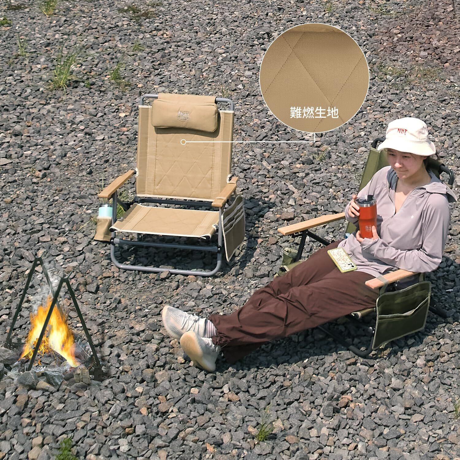 TIMBER RIDGE アウトドアチェア 折りたたみ椅子 3段リクライニング 焚き火チェア 難燃 ローチェア 携帯椅子 耐荷重150kg 天然木制肘掛 キャンプ 屋外 バーベキュー | BASE SHOP