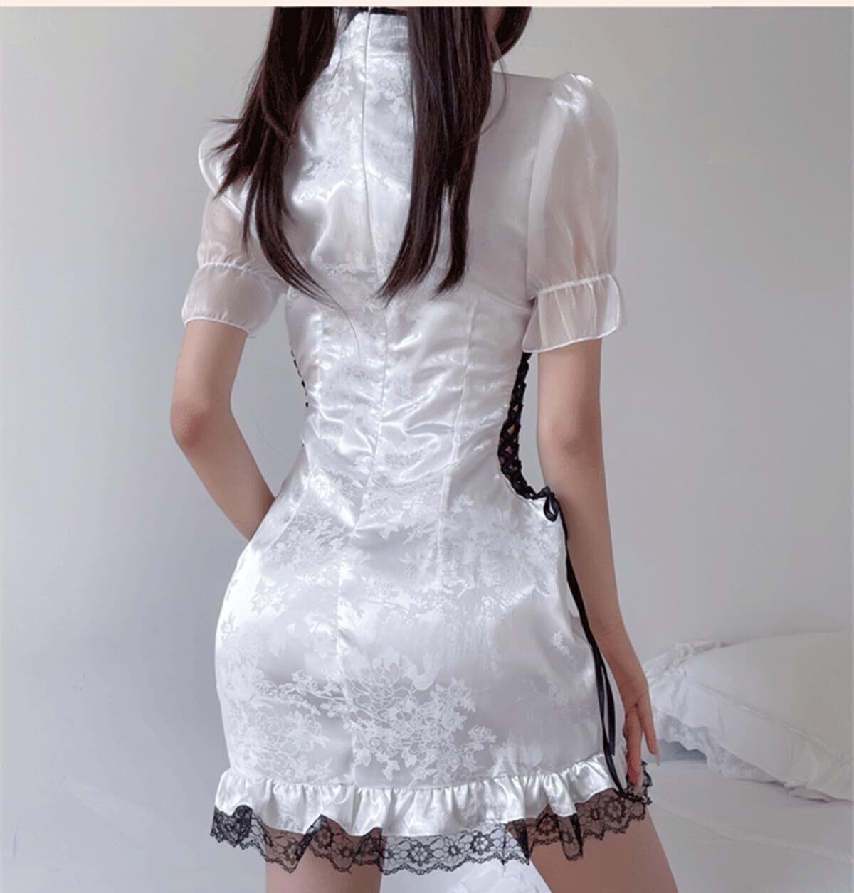 【キュートでセクシーなデザイン】(バックジッパーの問題に基づいて、倉庫の既存の在庫を確認しました。チャイナドレスは背中にジッパーがあり、サイドのウエストバンドにリボンが付いています。着脱が簡単ですので、安心してご購入いただけます。)中国風チャイナドレス コスプレ衣装は胸元は空洞になっており、スカートはリボンデザインになっており、キュートかつセクシーに見えます。ウエストの大胆なラインデザインが無限のセクシー魅力を醸し出し、彼を興奮させること間違いなし!大切な人とコスプレを満喫できます。