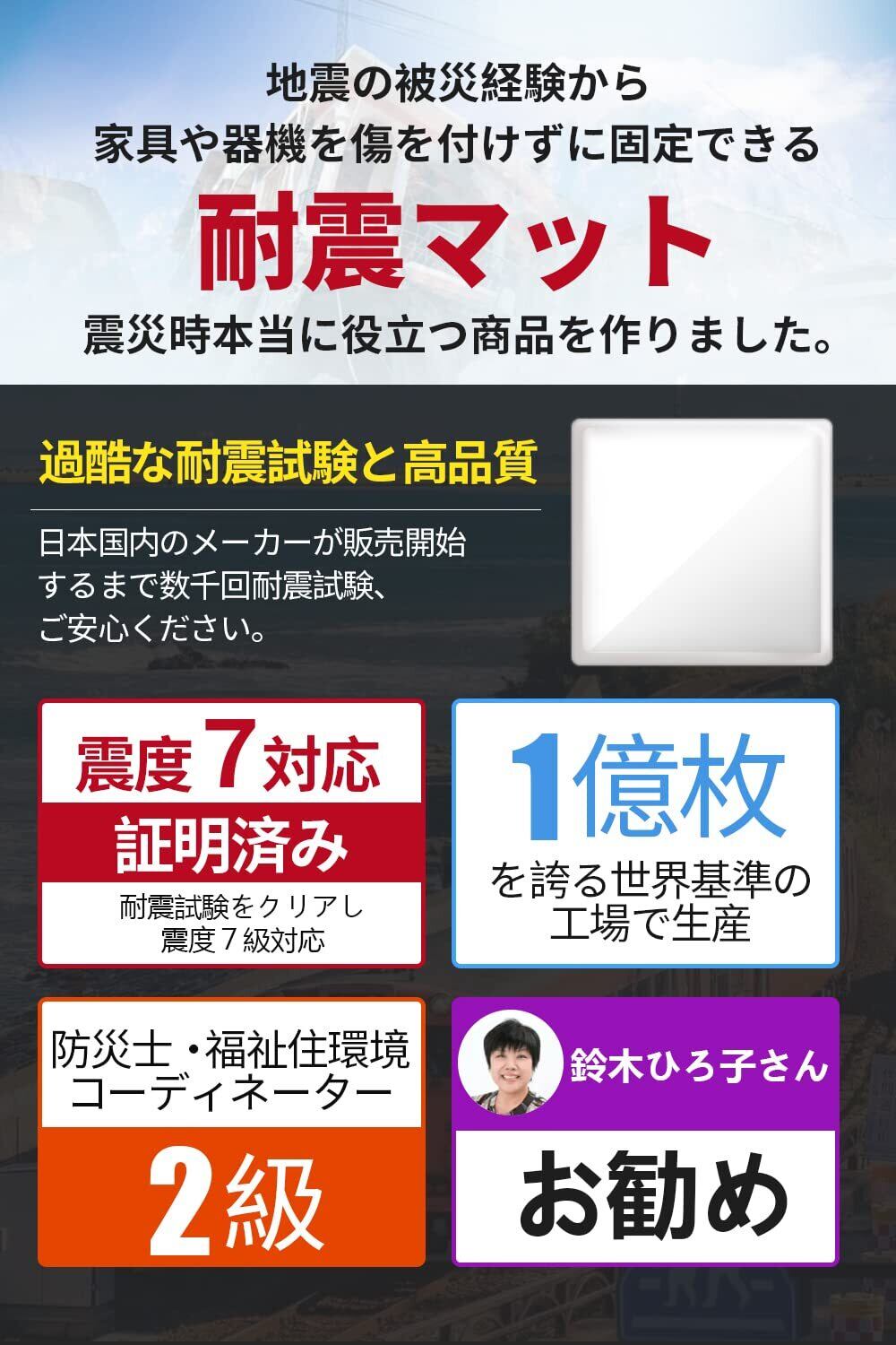 【2023年最新の耐震ジェル】弊社の耐震マットは最高級なPU素材を採用しており、日本国内のメーカーが販売開始するまで数千回耐震試験、震度7級対応できる、4枚以上の設置で耐荷重100kgでトップクラスの耐震力を持つことが可能です。これだけの耐荷重がありながら、はがすときは端をつまんでゆっくりと持ちあげるようにするとはがれるのも魅力。