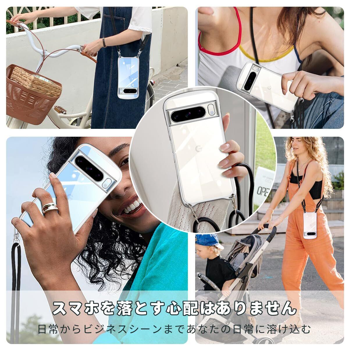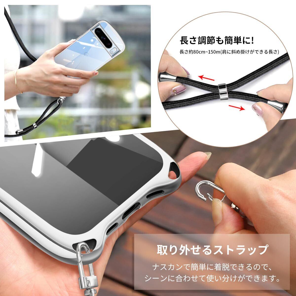 Google Pixel 8 Pro ケース クリア ショルダー ストラップ付き グーグル ピクセル8 プロ カバー 透明 肩掛け 縄掛け 斜めかけ TPU メッキ加工 耐衝撃 全面保護 薄型 韓国 可愛い pixel8 pro スマホケース (シルバー) | BASE SHOP