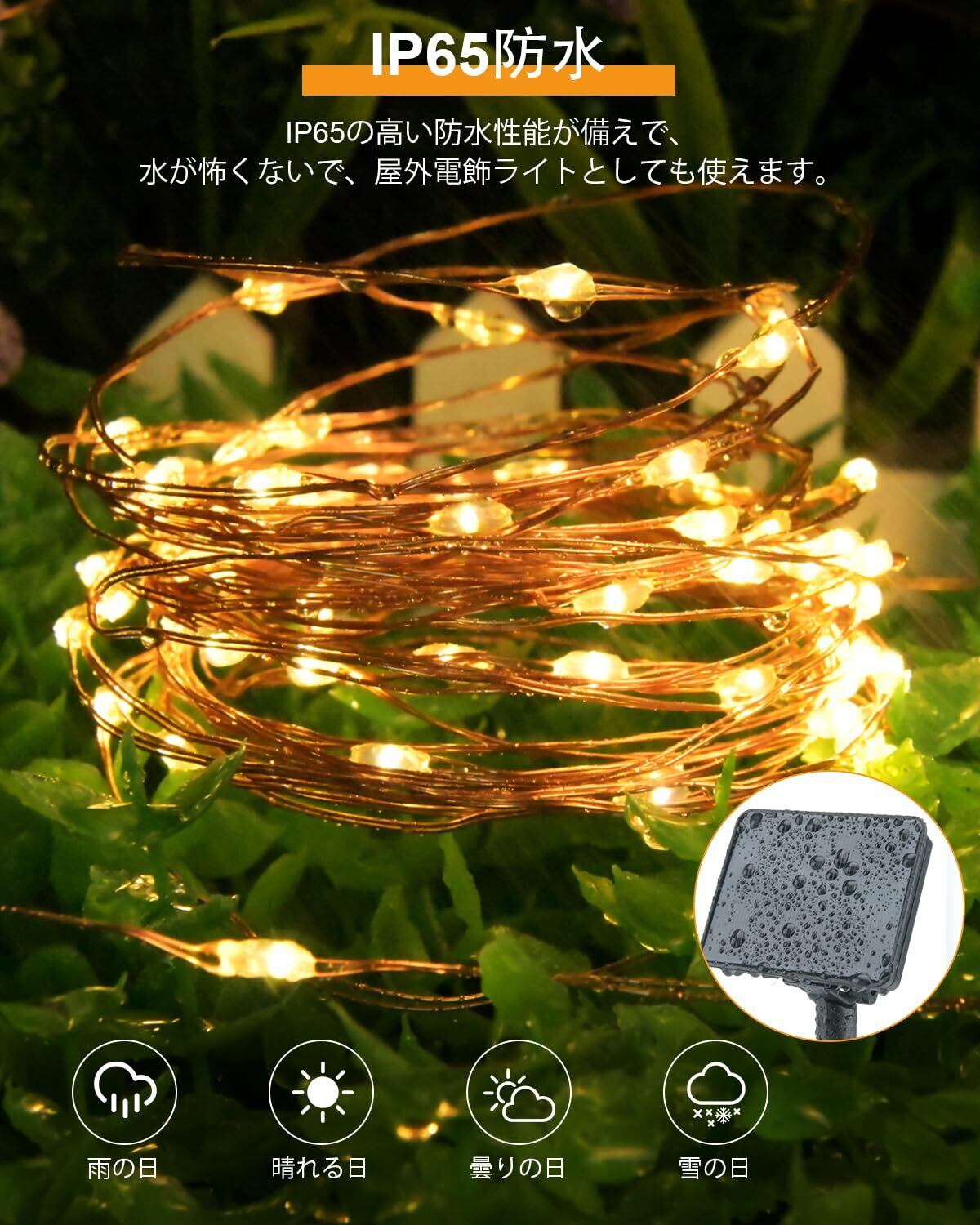 【IP65防水・屋外も室内も適用可能なソーラーライト】このクリスマス LED飾りライトは、ソーラーパネルもイルミネーションライト部もIP65の高い防水レベルを誇ります。雨に濡れても、雪の中でも、まったく問題ありませんので、悪天候でも平気に使えます!お庭やベランダ、玄関前、花壇、廊下、パーゴラ、フェンス、広場、キャンプサイトなど、屋外飾り用としてはもちろん、クリスマス飾りライトとして室内飾りにも最適です。クリスマス、ハロウィン、バレンタインデー、新年などの祝日、お誕生日や結婚式、母の日などの記念日、パーティーや学園祭など日常イベント、あらゆるシーンでの使用が可能です。この一つで、お想像できる限りの全ての場面をカバーできる、屋外 防水 LED イルミネーションライトです。