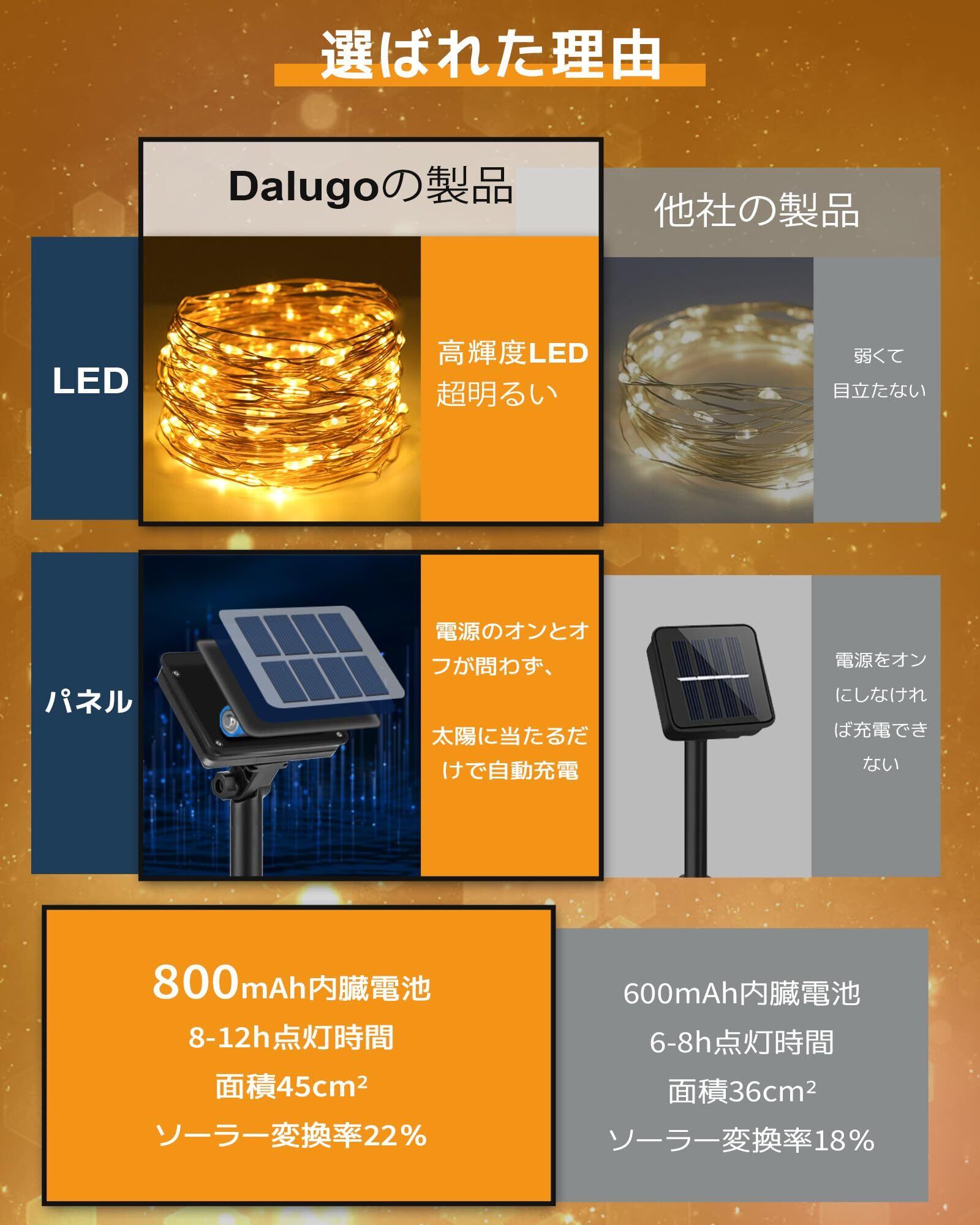 【高輝度LEDイルミネーション】Dalugoのソーラー LED ストリングライトは、高輝度ビーズを採用し、より一層明るく、美しく輝きます。暖色系のLEDライトは色が濃く、落ち着いたライティングを提供し、周囲の雰囲気を一層引き立てます。このソーラーライトがあれば、普通の夜が一瞬にしてキラキラと輝く特別な時間に変わります。LED イルミネーションライトで、あなたの大切な空間を最高のものにしましょう。