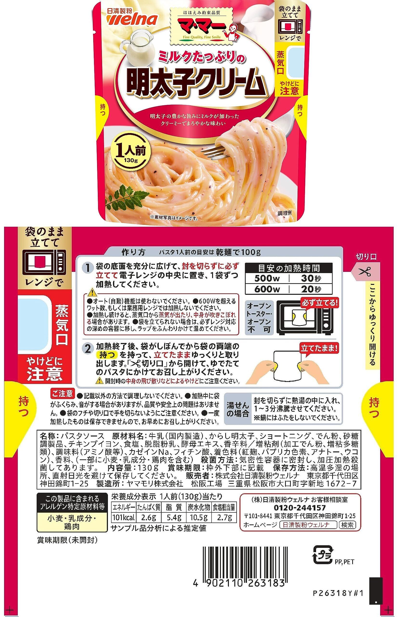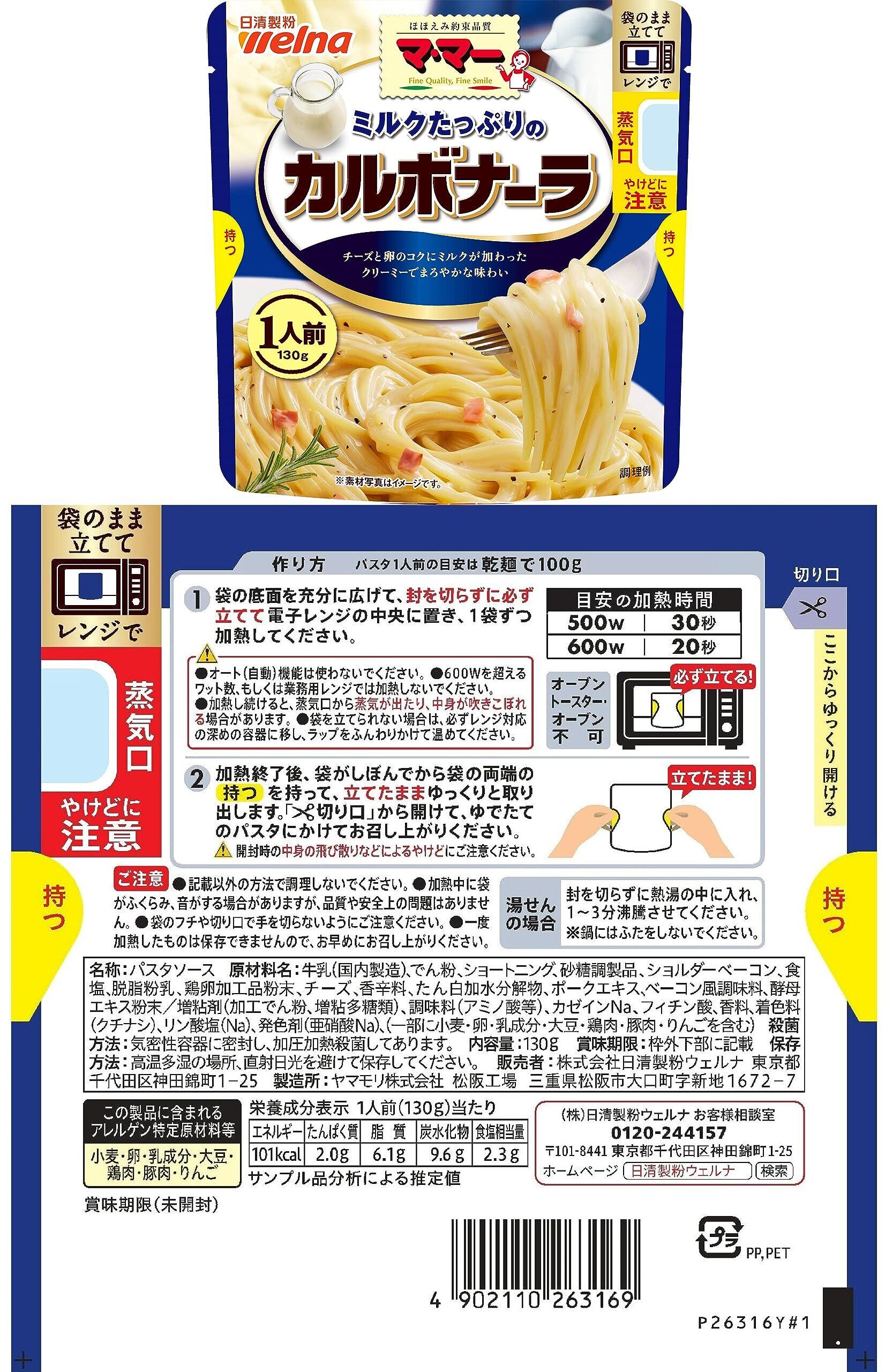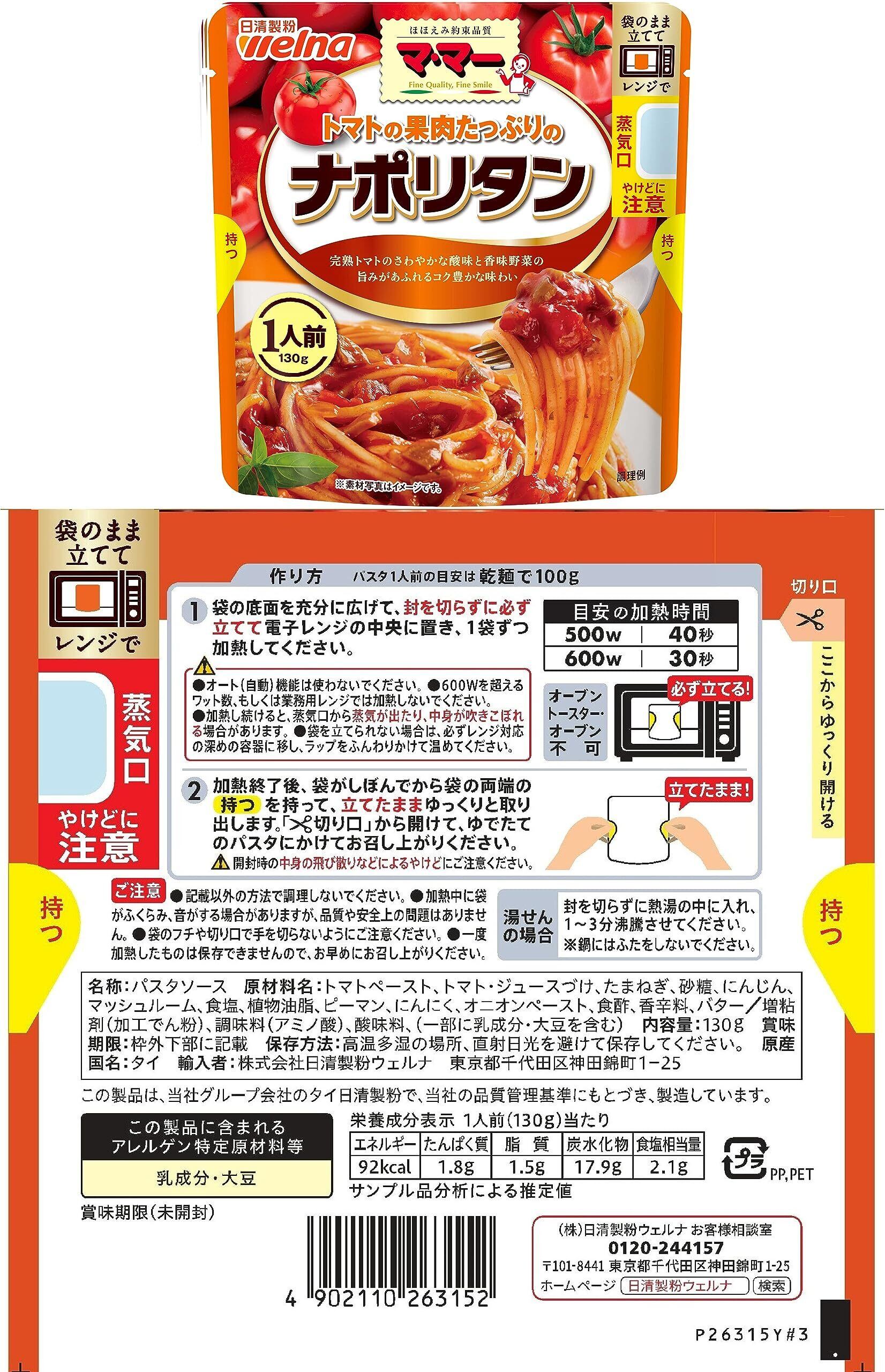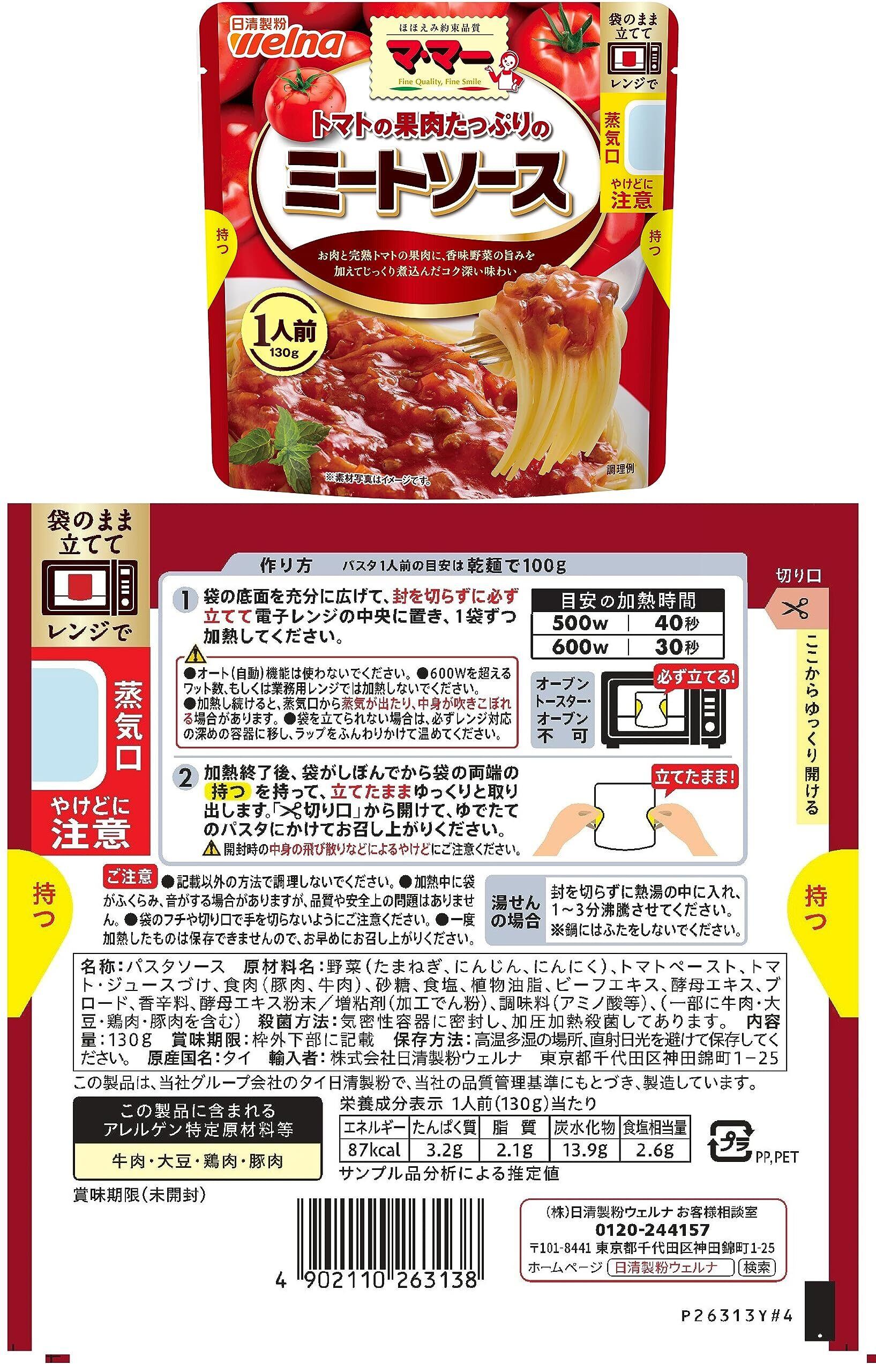 【果肉たっぷりのミートソース1人前】:お肉と完熟トマトの果肉に、香味野菜の旨みを加えてじっくり煮込んだコク深い味わい.電子レンジ調理対応の1人前シリーズ 【果肉たっぷりのナポリタン1人前】:完熟トマトのさわやかな酸味と香味野菜の旨みがあふれるコク豊かな味わい電子レンジ調理対応の1人前シリーズ 【ミルクたっぷりのカルボナーラ1人前】:チーズと卵のコクにミルクが加わったクリーミーでまろやかな味わい電子レンジ調理対応の1人前シリーズ 【ミルクたっぷりの明太子クリーム1人前】:ミルクをふんだんに使い、明太子の旨みにピリッと辛いブラックペッパーを加えた、コク豊かなソース。電子レンジ調理対応の1人前シリーズ 【香味野菜たっぷりのあさりの和風しょうゆにんにく風味 1人前】:香味野菜としょうゆと柚子果汁が引き立てるあさりの旨み豊かな味わい。電子レンジ調理対応の1人前シリーズ