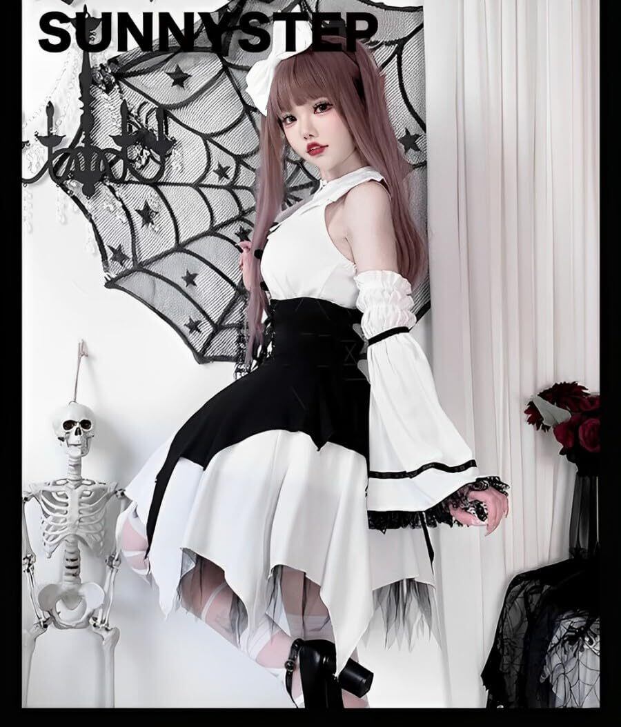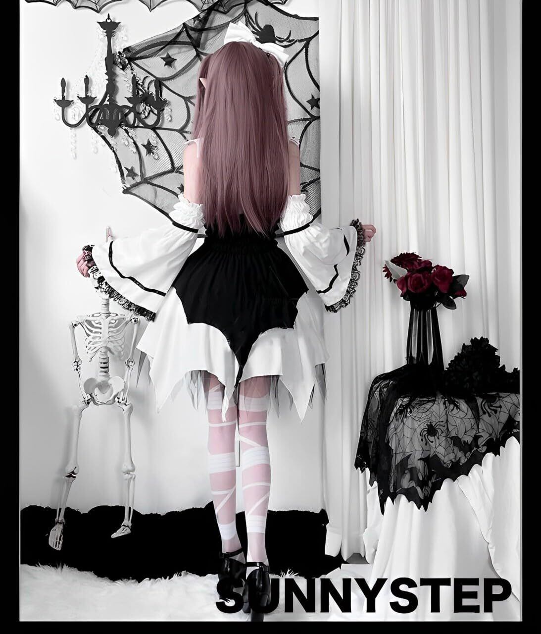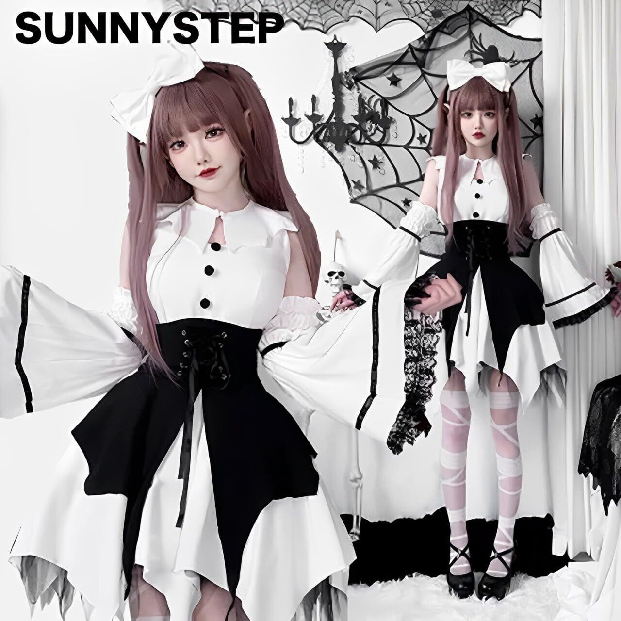 [SUNNYSTEP] ゴスロリ コスプレ ゴシック 小悪魔 かわいい リボン レース コスチューム ロリータ 袖付き セットアップ ワンピース サキュバス 白 黒 衣装 レース ミニ丈 アシンメトリー | BASE SHOP