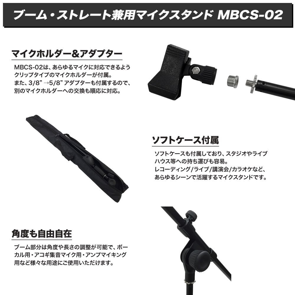 ソフトケースも付属しており、スタジオやライブハウス等への持ち運びも容易。レコーディング/ライブ/講演会/カラオケなど、あらゆるシーンで活躍するマイクスタンドです。