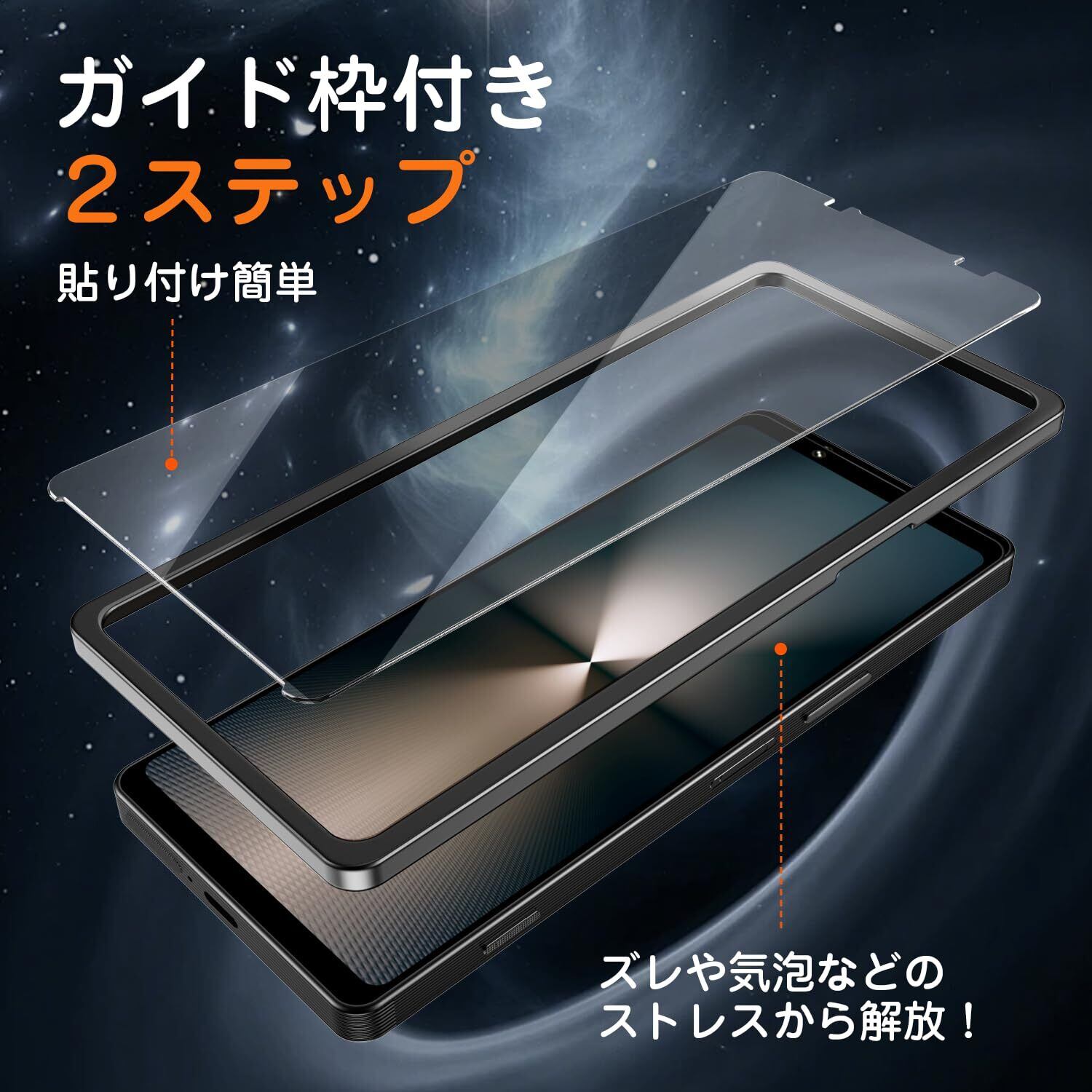【貼り付け簡単&ガイド枠付き】 2ステップだけで、初心者として完璧に貼り付け!画面に置くだけでキレイに貼れ、気泡も抜けやすい。CNC彫刻加工を採用されたガイド枠はXperia 1 VIIの画面にぴったりして、ズレなどのストレスから解放!
