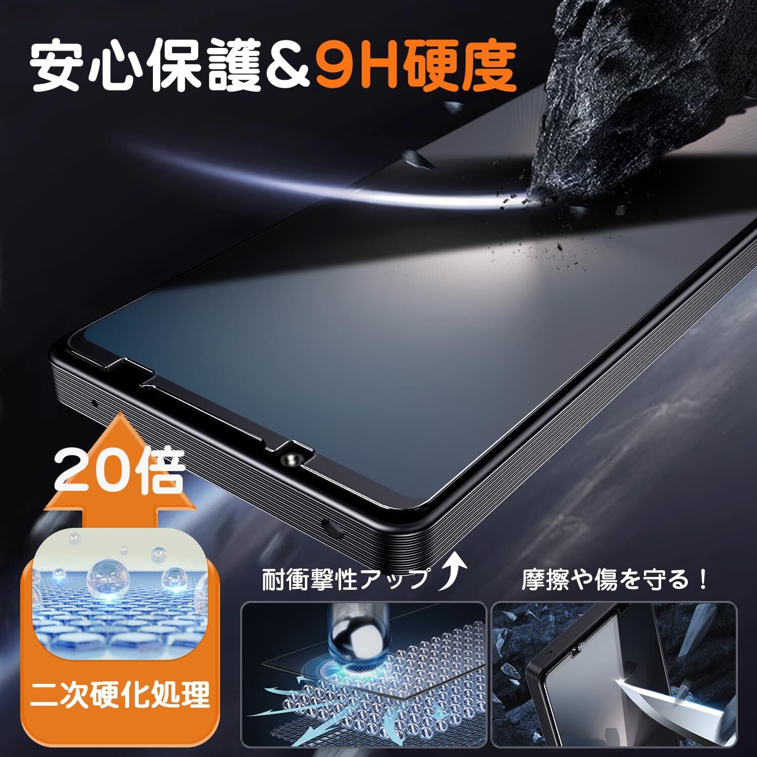 【二次硬化处理&9h硬度】Xperia 1 VIIフィルムは日本製AGCのガラス材料を採用し、一般的な熱強化処理を行った後に、二次硬化処理を行っています。1000回以上のひっかき傷テストと落下テストに無傷と、落下に対する耐性が高い。每年にわたって、日本で累計10万枚販売し、画面の破損記録がゼロとなっています。