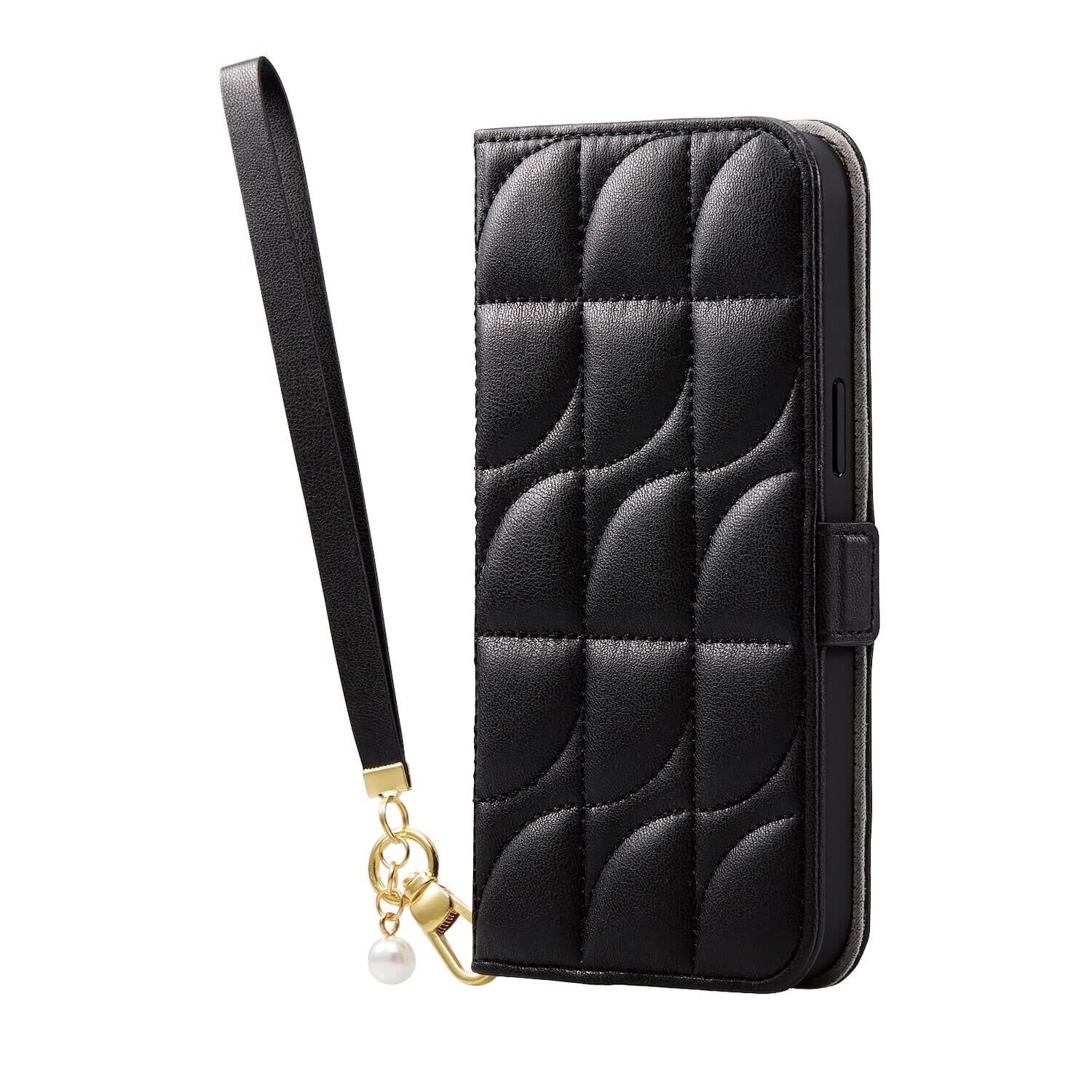 エレコム iPhone 14 Pro Max ケース カバー レザー 手帳型 マグネット フラップ 耐衝撃 衝撃吸収 スタンド機能付 ハンドストラップ付 キルティング ミラー付 ブラック PM-A22DPLFJM4BK | BASE SHOP