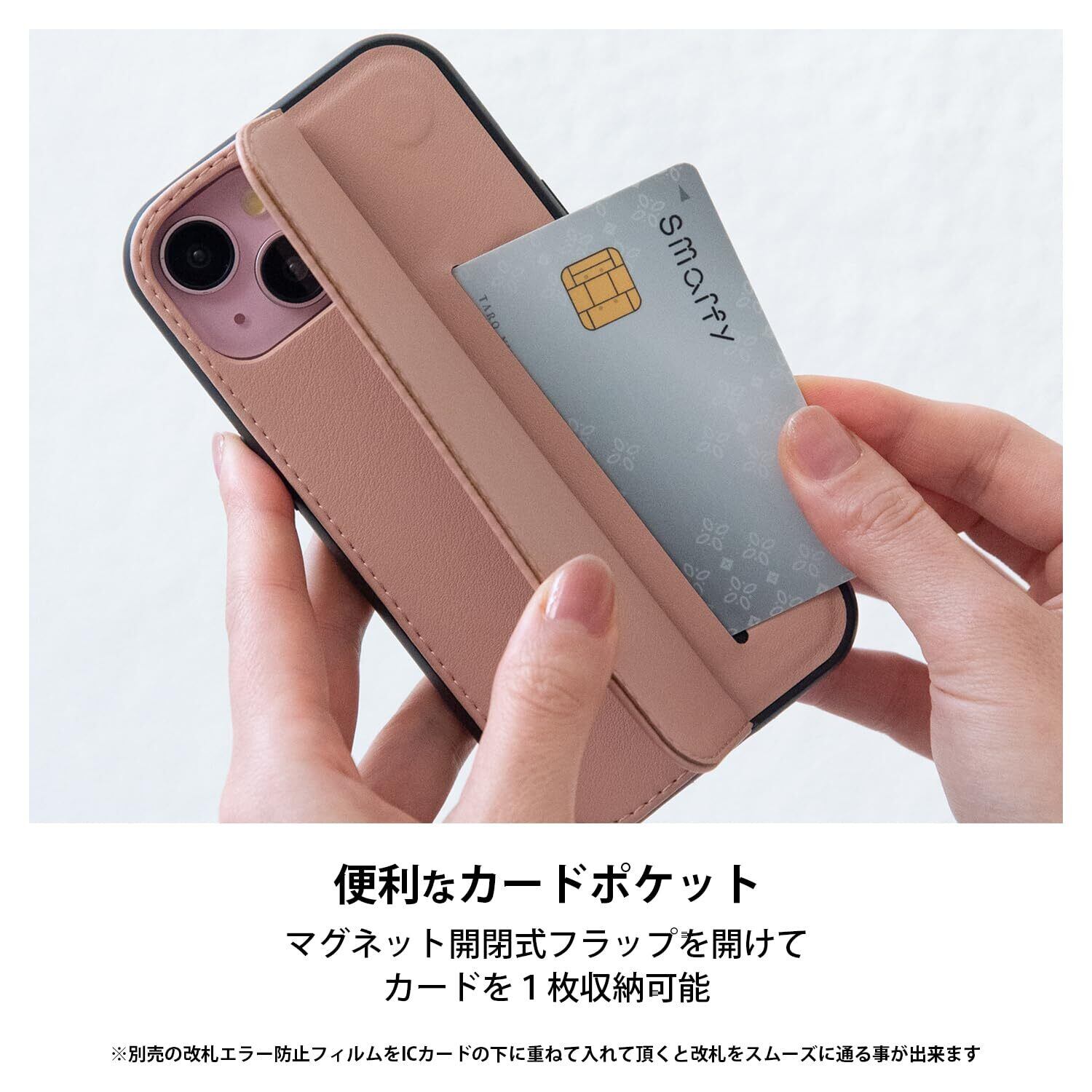 【マグネット開閉カード収納】開閉機能がついており、フラップを開けるとカードが収納できます。※ICカードを収納される場合は、干渉防止のための別途改札エラー防止フィルム(別売)をお買い求め下さい。