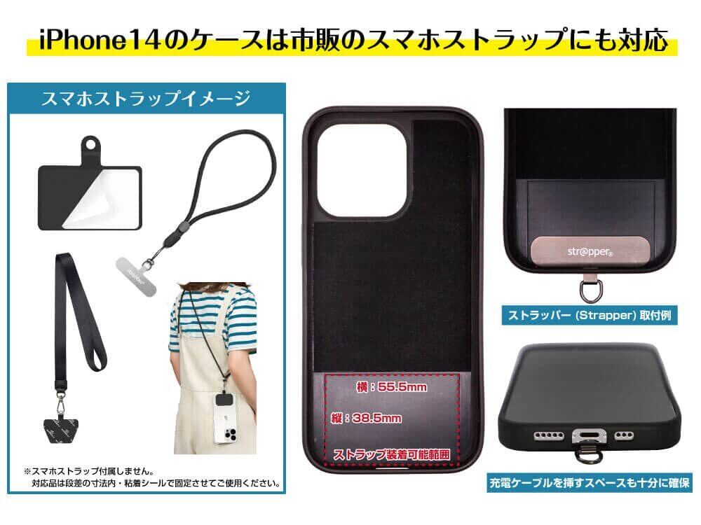 モチロン ケースを装着したまま充電、イヤホン、カメラの使用が可能。ストラップも付属し通す穴もあいています。別売り:スマホリング[R+Ring3]やマグネット式 ワイヤレス充電器 対応 iPhoneケース用 貼付けアダプター【R+Magsafe-AD】にも対応