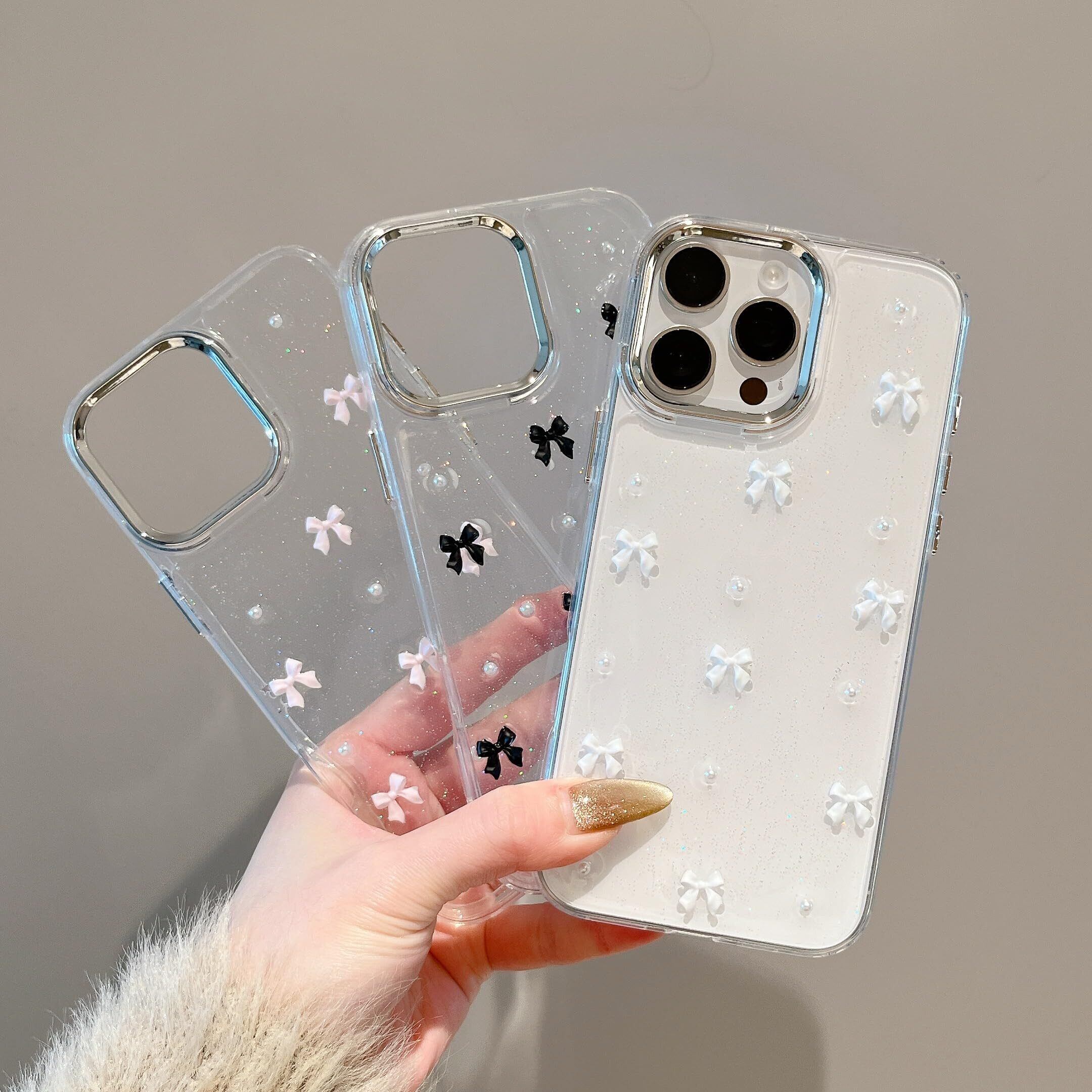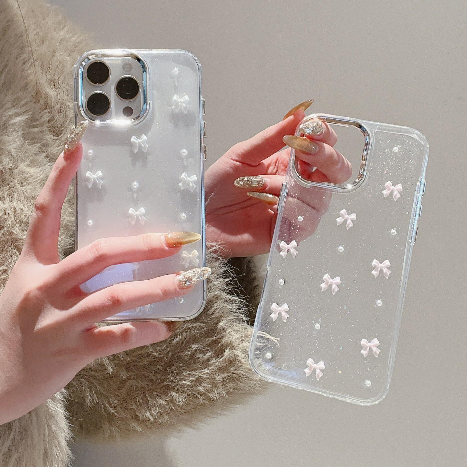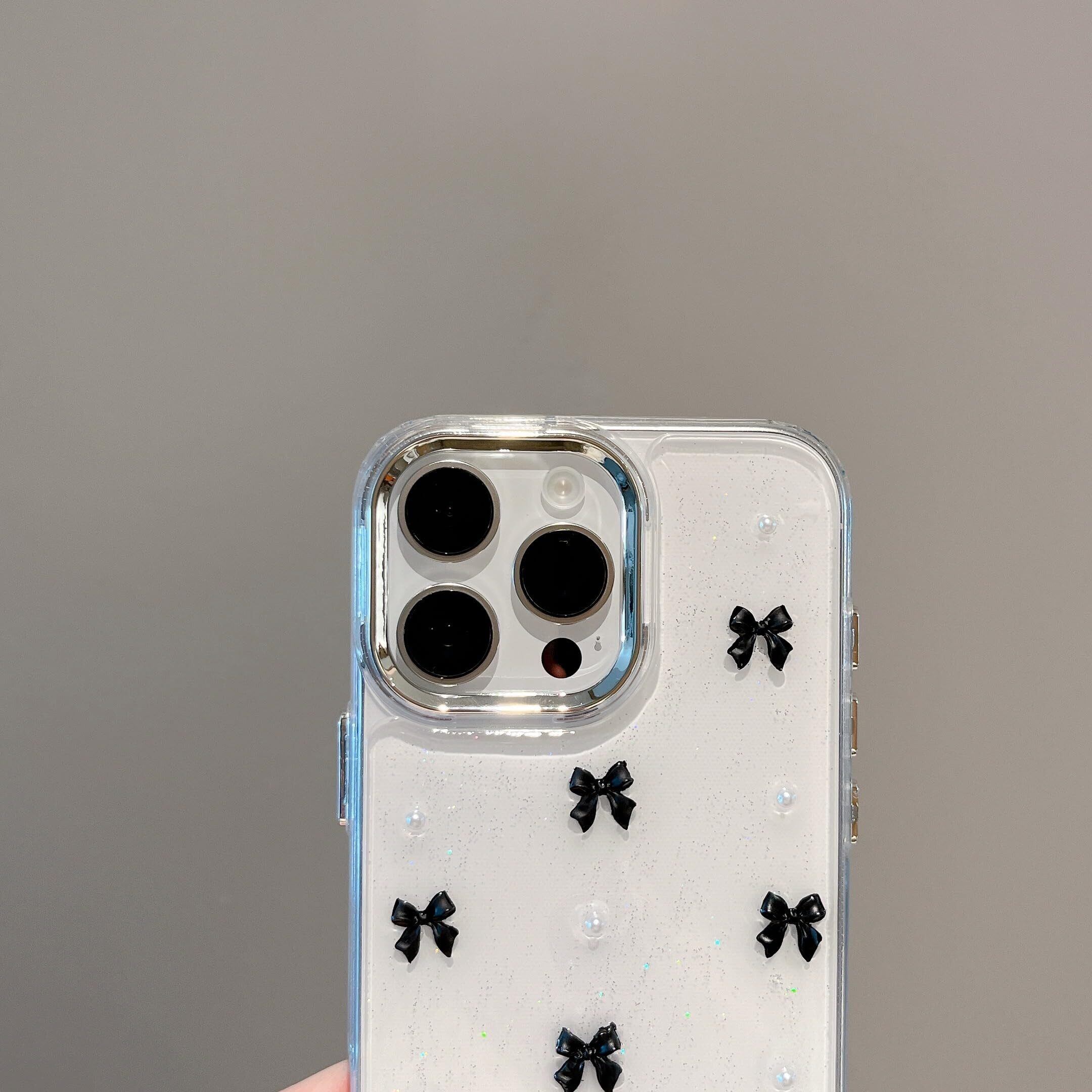 【3D ミニリボン デザイン 】背面はシルバーの小さなリボンと、埋め込まれている目を引くグリッターが剥がれ落ちたりしなく、可愛い、流行りの韓国デザインです!カメラ周りのシルバーフレームは、取り外し可能なデザインとなっております、お好みに合わせて、シルバーフレームの有無ご利用くださいませ。