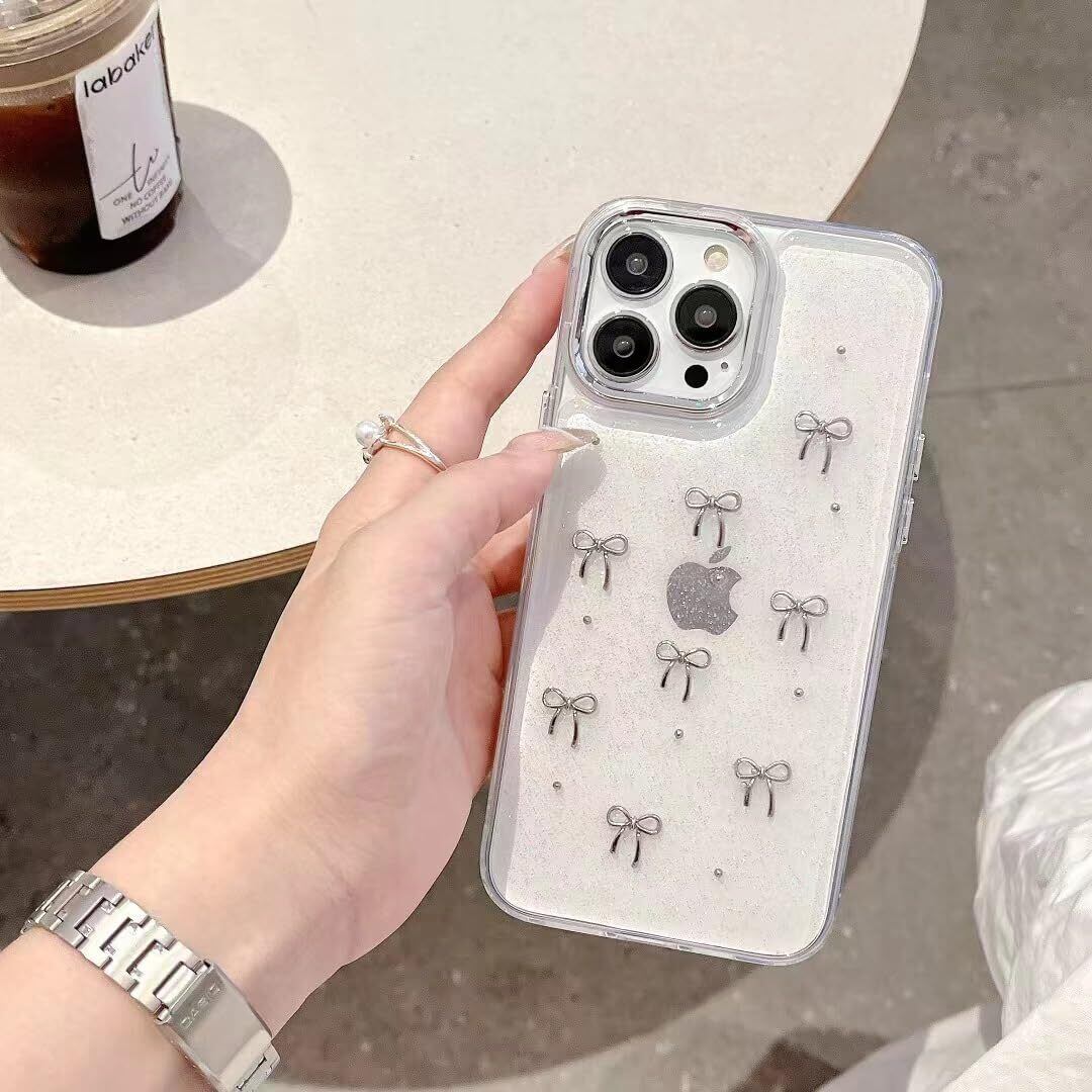 QLTYPRI iPhone15 ケース クリア シルバー ミニリボン おしゃれ 韓国 iPhone15ケース 透明 可愛い 耐衝撃 スマホケース 立体 りぼん装飾 きらきら アイフォン15 ケース、シルバー