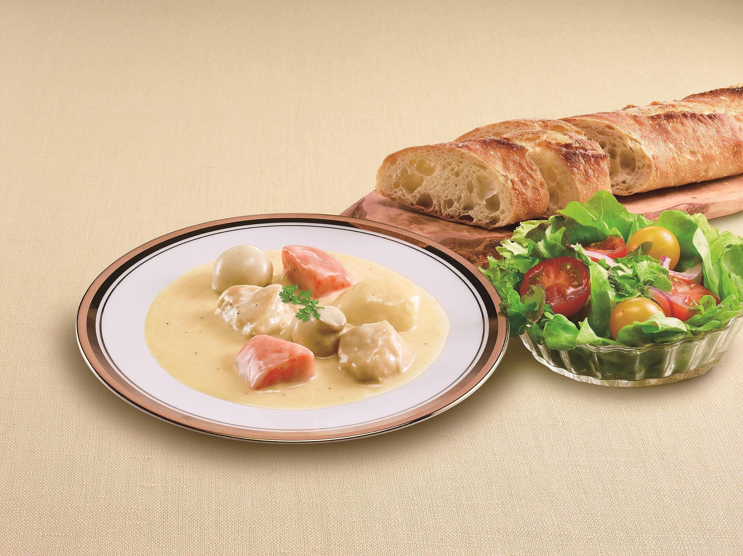 大きくカットしたじゃがいも、にんじん、ホールのマッシュルーム、ハーブオイルでマリネした鶏肉のたっぷり具材。北海道産生クリームを加え、クリーミーで濃厚感とまろやかな口どけに仕立てたクリームシチューです。レンジ調理できるようになりました。