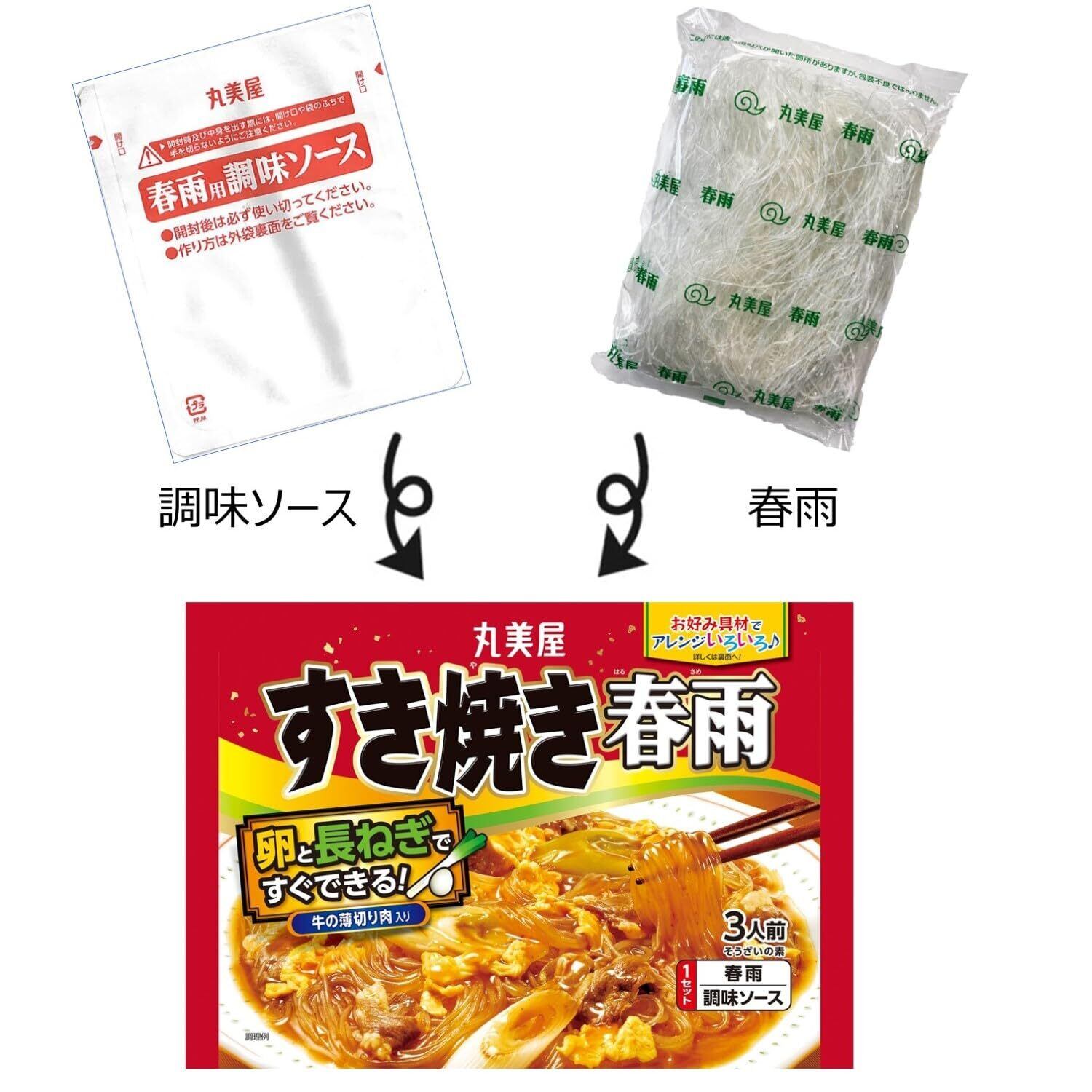[調味ソース]牛肉、醤油、砂糖、発酵調味料、牛脂、ビーフエキス調味料、食塩、酵母エキス/増粘剤(加工でん粉、キサンタン)、調味料(アミノ酸等)、カラメル色素、香料、(一部に小麦・牛肉・大豆を含む)| [春雨]春雨(緑豆でん粉、えんどう豆でん粉)(中国製造)