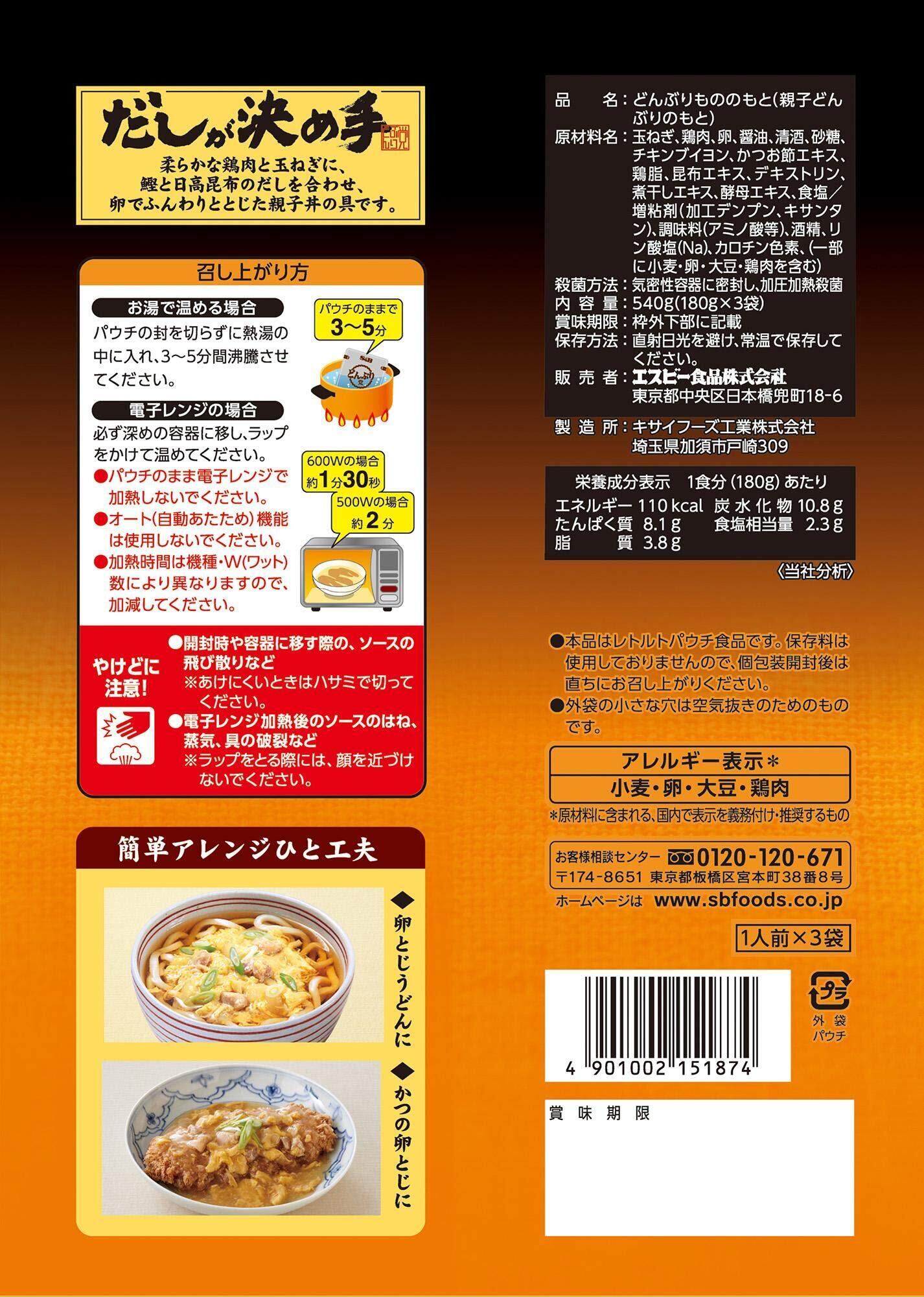 玉ねぎ、鶏肉、卵、醤油、清酒、砂糖、チキンブイヨン、かつお節エキス、鶏脂、昆布エキス、デキストリン、煮干しエキス、酵母エキス、食塩/増粘剤(加工デンプン、キサンタン)、調味料(アミノ酸等)、酒精、リン酸塩(Na)、カロチン色素、(一部に小麦・卵・大豆・鶏肉を含む)