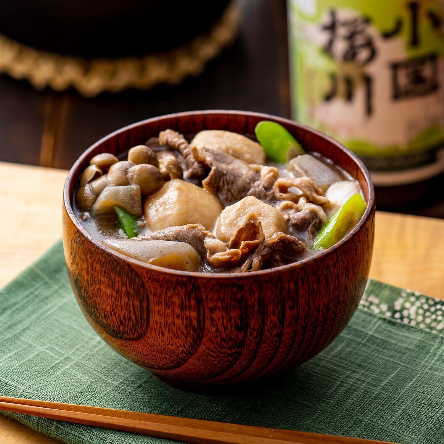 山形秋の風物詩・いも煮会。芋煮会の出来立ての味を再現しました。国産の里芋と同じく国産の軟らかく煮込んだ牛スジ肉を贅沢に使用した山形の誇るソウルフード芋煮をご家庭で簡単にお召し上がりいただけます。
