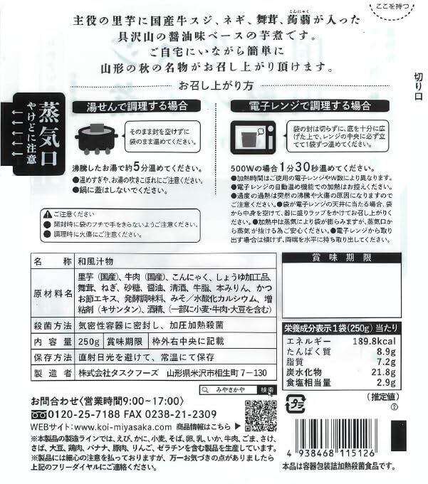 里芋(国産)、牛肉(国産)、こんにゃく、しょうゆ加工品、舞茸、ねぎ、砂糖、醤油、清酒、牛脂、本みりん、かつお節エキス、発酵調味料、みそ/水酸化カルシウム、増粘剤(キサンタン)、清酒、(一部に小麦・牛肉・大豆を含む)