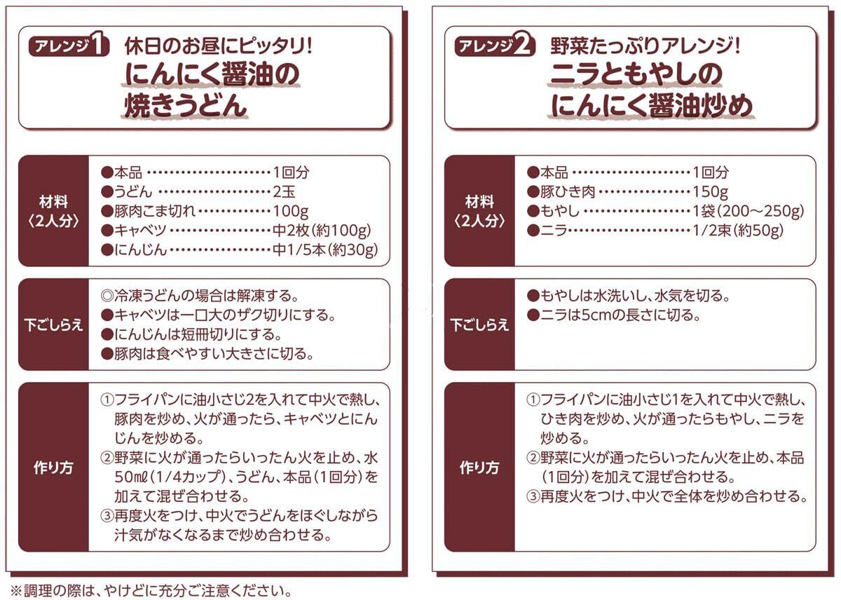 原材料:醤油(国内製造)、にんにくペースト、砂糖、発酵調味料、にんにく、食塩、フライドオニオン、フライドガーリック、醸造酢、ガーリックパウダー、たん白加水分解物、胡椒、デキストリン/増粘剤(加工でん粉、キサンタン)、カラメル色素、調味料(アミノ酸)、(一部に小麦・大豆を含む)