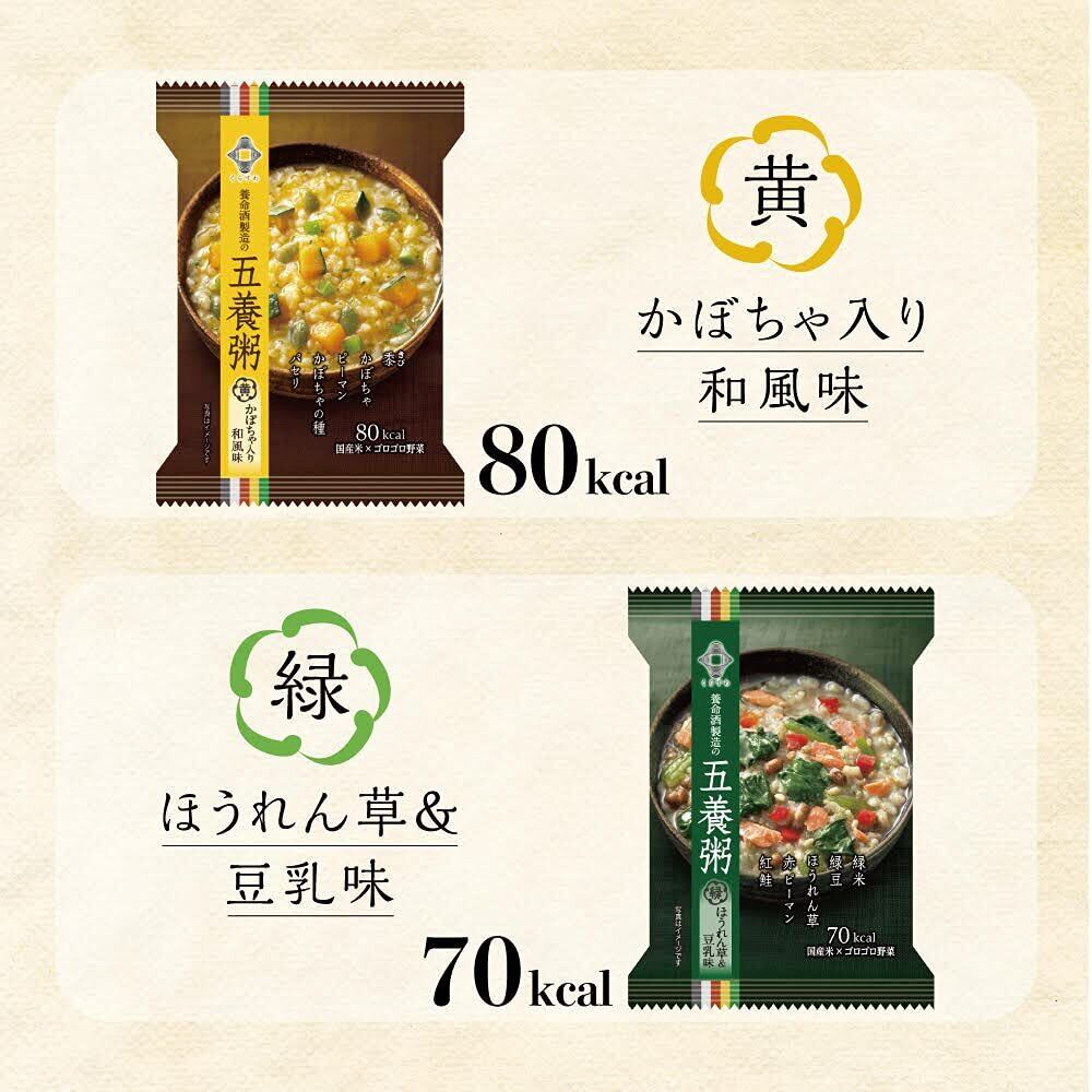 【黒】精白米(国産)、チンゲン菜、黒米(国産)、エキス(チキンエキス、ほたてエキス、酵母エキス)、しょうゆ、おろししょうが、クコの実、でん粉、食塩、ごま油、たん白加水分解物、乾椎茸、ごま、高麗人参、オイスターソース、トレハロース、酸化防止剤(V.E)、(原材料の一部に小麦、豚肉、魚醤(魚介類)を含む) 【赤】精白米(国産)、ソテーオニオン、ドライトマト、トマトペースト、玉ねぎ、オリーブ、赤米(国産)、マッシュルーム水煮、エキス(チキンエキス、野菜エキス、酵母エキス)、食塩、でん粉、たん白加水分解物、香辛料、酸化防止剤(V.E)、酸味料、(原材料の一部に小麦、乳成分、大豆を含む) 【緑】精白米(国産)、豆乳、ほうれん草、ピーマン、エキス(チキンエキス、野菜エキス、酵母エキス)、紅鮭、緑米(国産)、緑豆、ほうれん草ペースト、食塩、でん粉、たん白加水分解物、ガーリックパウダー、胡椒、トレハロース、酸化防止剤(V.E)、甘味料(ステビア)、(原材料の一部に乳成分、小麦、大豆を含む) 【黄】精白米(国産)、かぼちゃペースト、かぼちゃ、ピーマン、かぼちゃの種、もちきび、食塩、でん粉、鰹節エキスパウダー、酵母エキス、たん白加水分解物、パセリ、酸化防止剤(V.E)、(原材料の一部に豚肉を含む) 【白】精白米(国産)、白菜、鶏卵、ビーフエキスパウダー、はと麦、丸麦、しょうが、でん粉、松の実、たん白加水分解物、食塩、おろししょうが、酵母エキス、キクラゲ、乾燥ねぎ、ガーリックパウダー、オニオンパウダー、酸化防止剤(V.E)、(原材料の一部に乳成分、小麦、大豆、豚肉を含む)