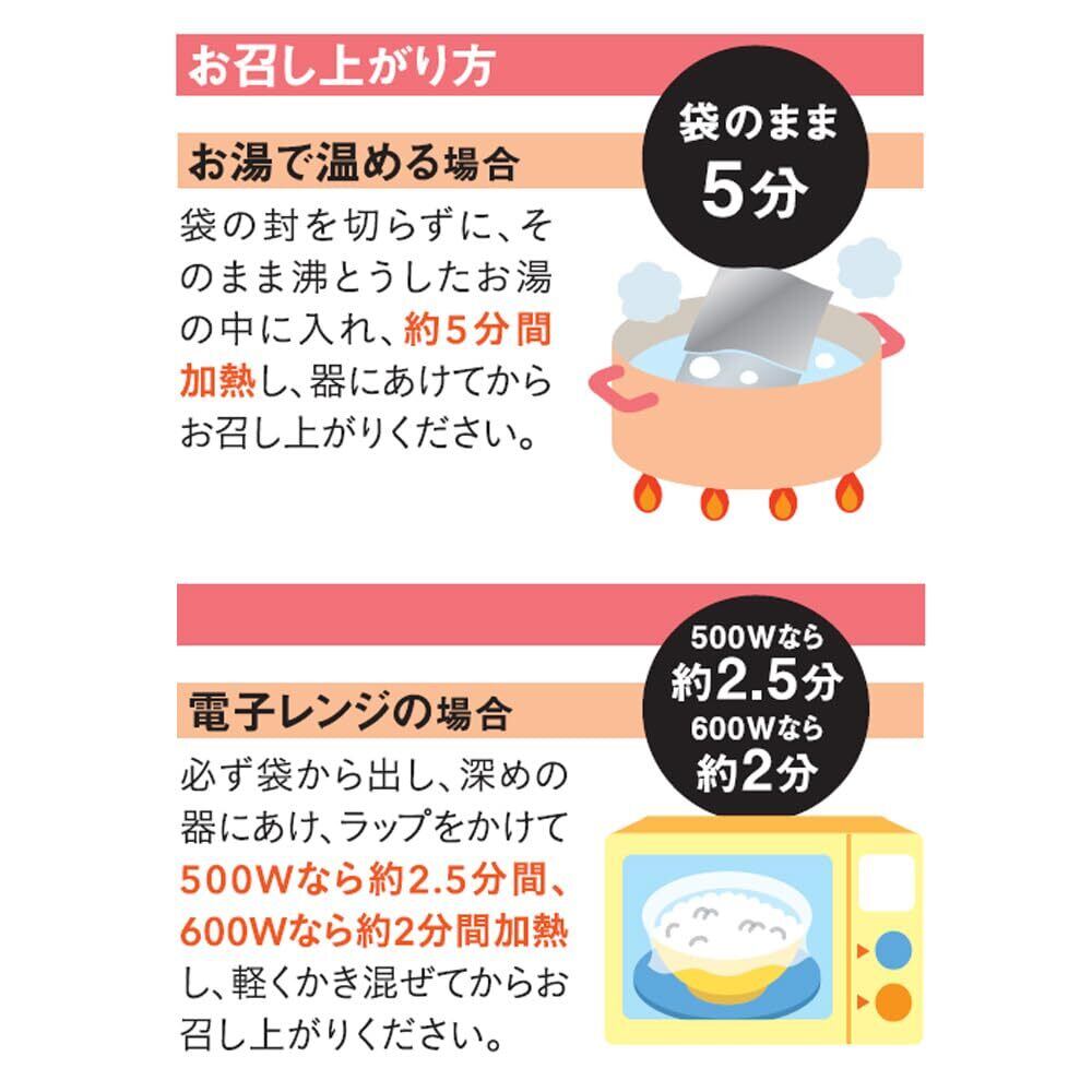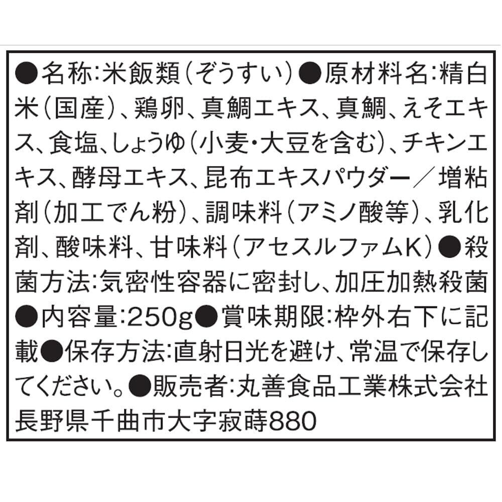 精白米(国産)、鶏卵、真鯛エキス、真鯛、えそエキス、食塩、しょうゆ(小麦・大豆を含む)、チキンエキス、酵母エキス、昆布エキスパウダー/増粘剤(加工でん粉)、調味料(アミノ酸等)、乳化剤、酸味料、甘味料(アセスルファムK)