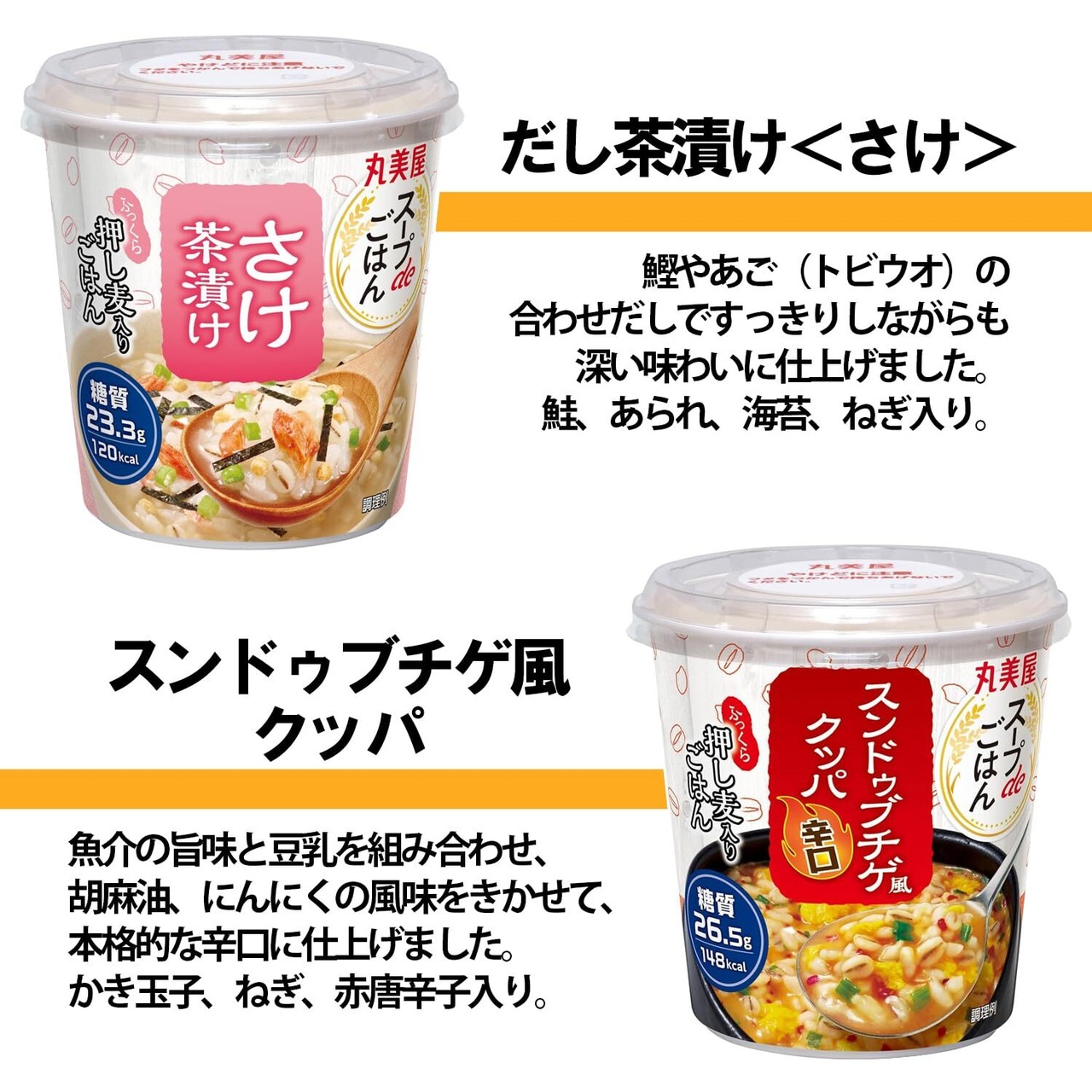 【セット内容】スープdeごはん かに鍋風雑炊 69g ×2個、スープdeごはん 鶏しお雑炊 70.3g ×2個、スープdeごはん だし茶漬け さけ 66.6g ×2個、スープdeごはん スンドゥブチゲ風クッパ辛口 74.6g ×2個、スープdeごはん 参鶏湯風クッパ 70.2g ×1個、スープdeごはん ユッケジャンクッパ 69.8g ×1個、スープdeごはん トムヤムクン風ごはん 69.7g ×1個、スープdeごはん 3種のチーズスープリゾット 75g ×1個