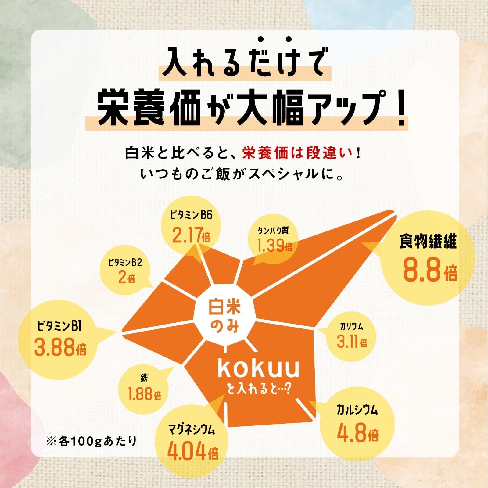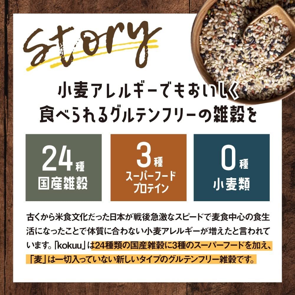 【シリーズ累計販売実績400万食突破※】「毎日食べたい。」女性の「嬉しい」がギュッと詰まった雑穀です。※2021年1月〜2022年5月 販売実績 ※1食15g換算。フードコーディネーターHiroさん監修グルテンフリー「kokuu雑穀」 食べた人の健康や美しさを育むということから、日本の伝統的な言葉であり、『穀物の成長を助ける雨』を 意味するkokuu(穀雨・こくう)という商品名を名付けました。