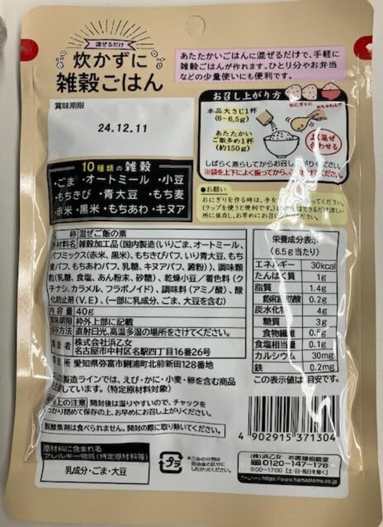 【原材料】雑穀加工品(国内製造(いりごま、オートミール、パフミックス(赤米、黒米)、もちきびパフ、いり青大豆、もち麦パフ、もちあわパフ、乳糖、キヌアパフ、澱粉))、調味顆粒(乳糖、食塩、あん粉末、砂糖)、乾燥小豆/着色料(クチナシ、カラメル、フラボノイド)、調味料(アミノ酸)、酸化防止剤(V.E)、(一部に乳成分・ごま・大豆を含む)