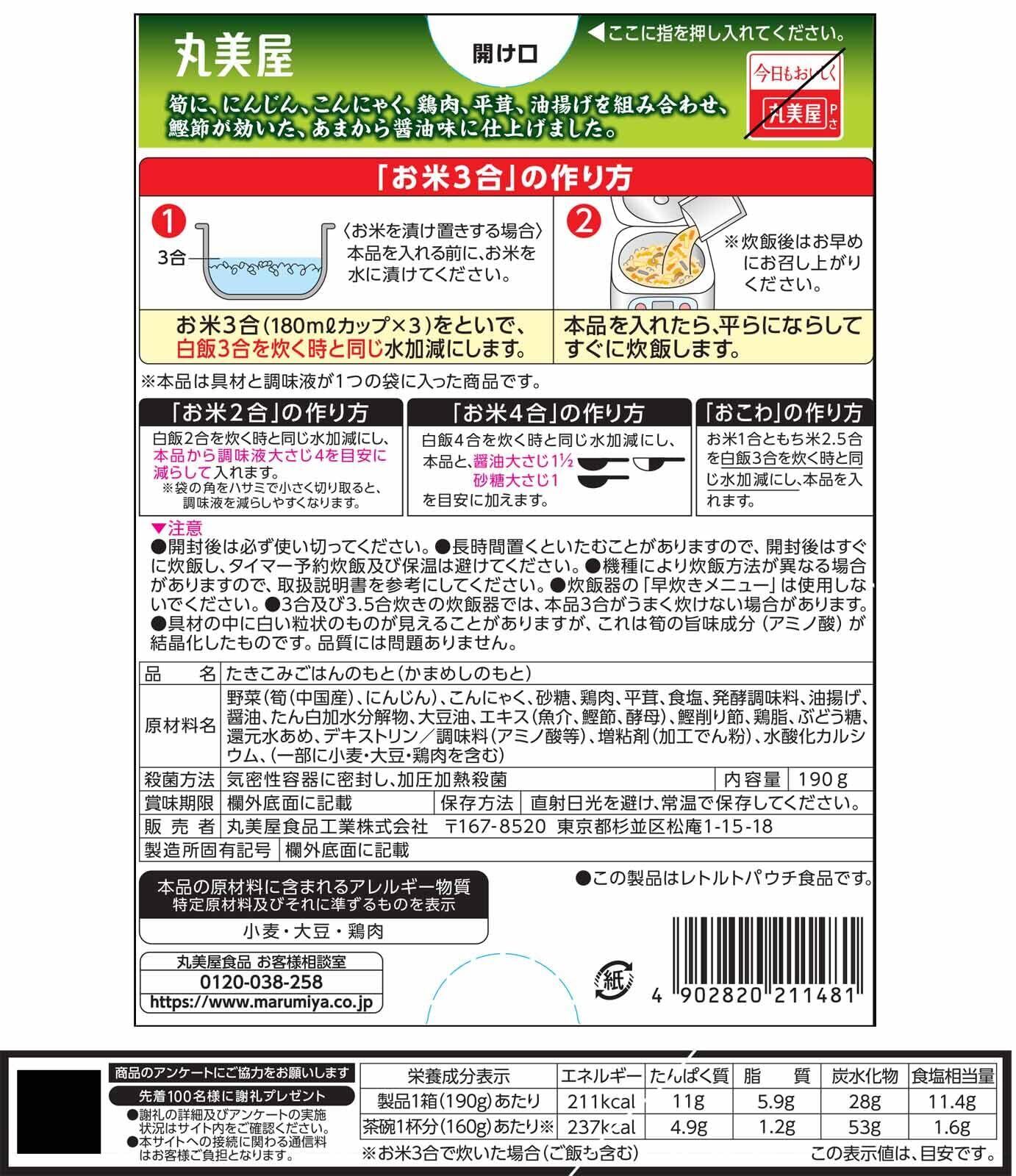 原材料:野菜(筍(中国産)、にんじん)、こんにゃく、砂糖、鶏肉、平茸、食塩、発酵調味料、油揚げ、醤油、たん白加水分解物、大豆油、エキス(魚介、鰹節、酵母)、鰹削り節、鶏脂、ぶどう糖、還元水あめ、デキストリン/調味料(アミノ酸等)、増粘剤(加工でん粉)、水酸化カルシウム、(一部に小麦・大豆・鶏肉を含む)