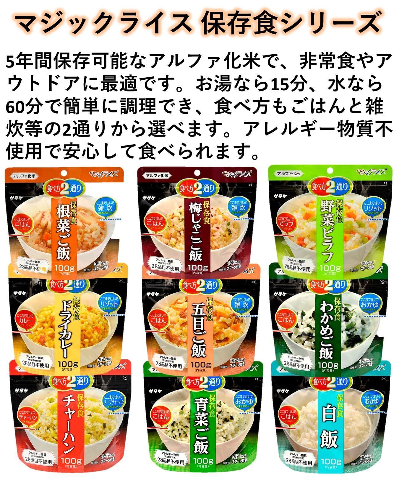 ドライカレー、五目御飯、エビピラフ、わかめご飯、白米、パエリア風ご飯、根菜ご飯、青菜ご飯、梅じゃこご飯の9種です。非常食に最適!アルファ米を使用したサタケ マジックライス。備蓄品はもちろん、登山やレジャーにも!