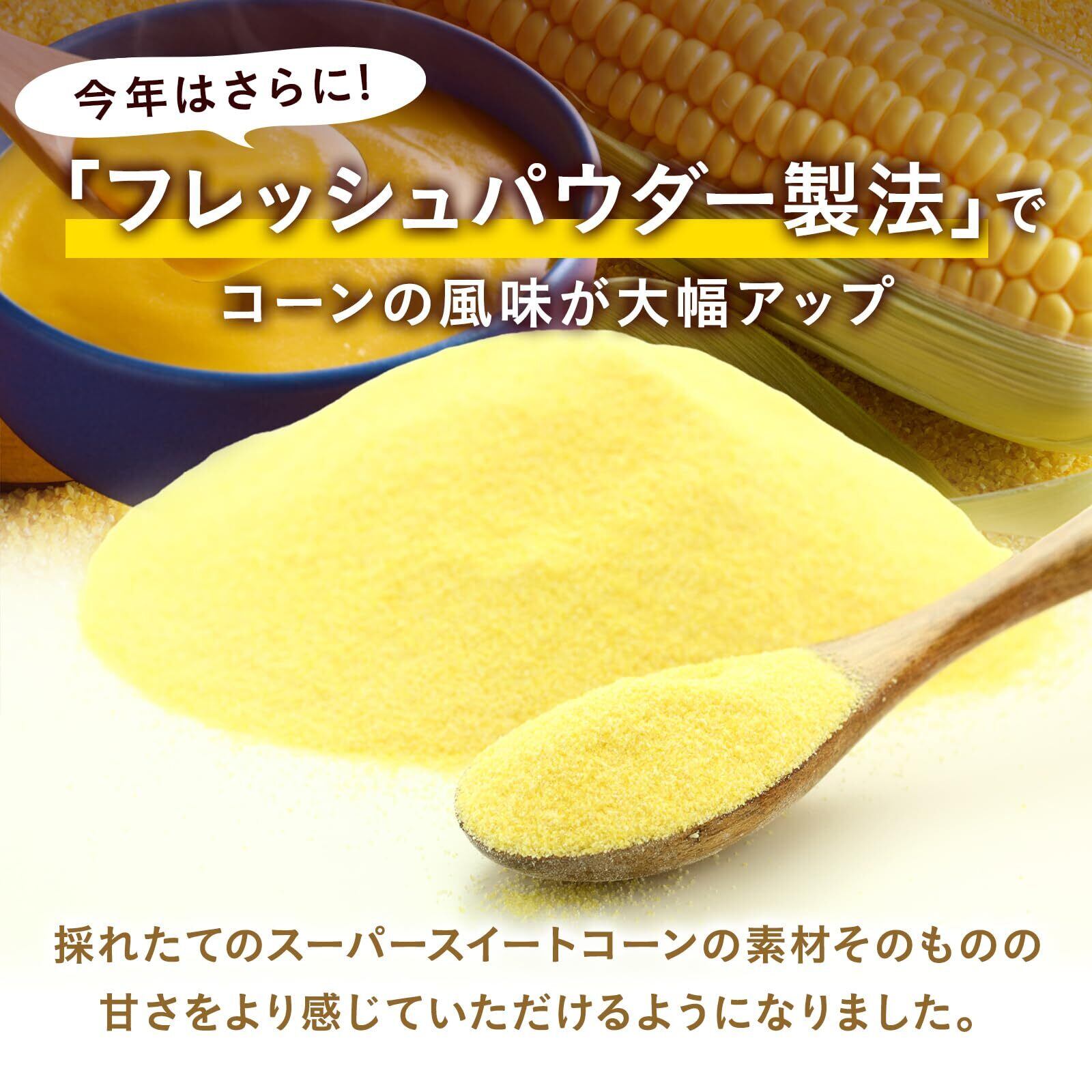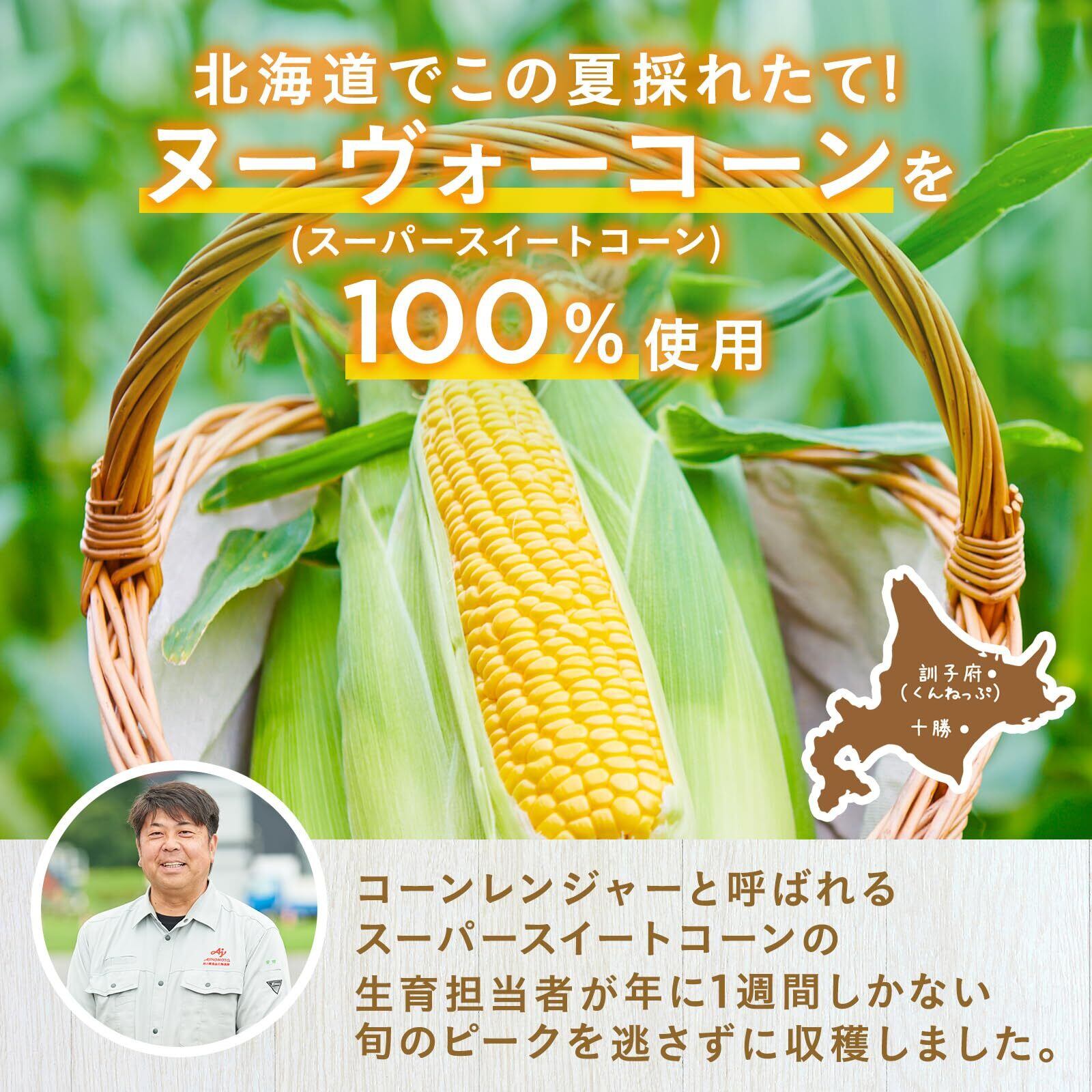 甘さ絶頂期に収穫したスーパースイートコーンを24時間以内にコーンパウダーにすることで、旬ならではのおいしさをギュッと閉じ込めています。