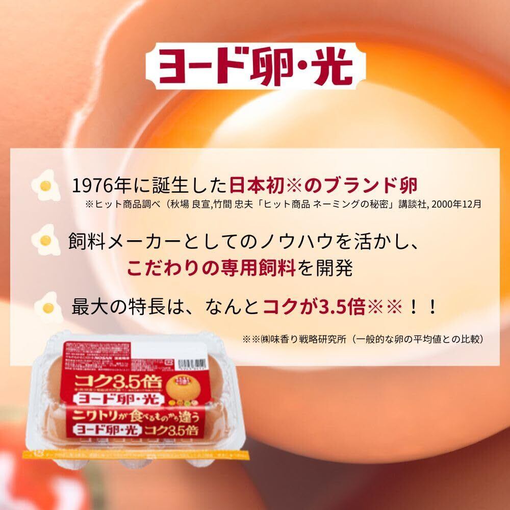【ヨード卵・光とは?】 「ヨード卵・光」は1976年に誕生した日本初※のブランド卵です。ブランド卵の先駆けとして、ニワトリの食べるもの”そもそもからこだわり”約20年の研究を経て「ヨード卵・光」専用飼料を開発、試行錯誤を繰り返しながら誕生しました。味覚センサーで測定した所、一般的な卵の平均値と比較してコクが3.5倍※※あることが分かっており、その美味しさは科学的に証明されています。 ※ヒット商品調べ(秋場 良宣,竹間 忠夫「ヒット商品 ネーミングの秘密」講談社, 2000年12月) ※※㈱味香り戦略研究所(一般的な卵の平均値との比較)